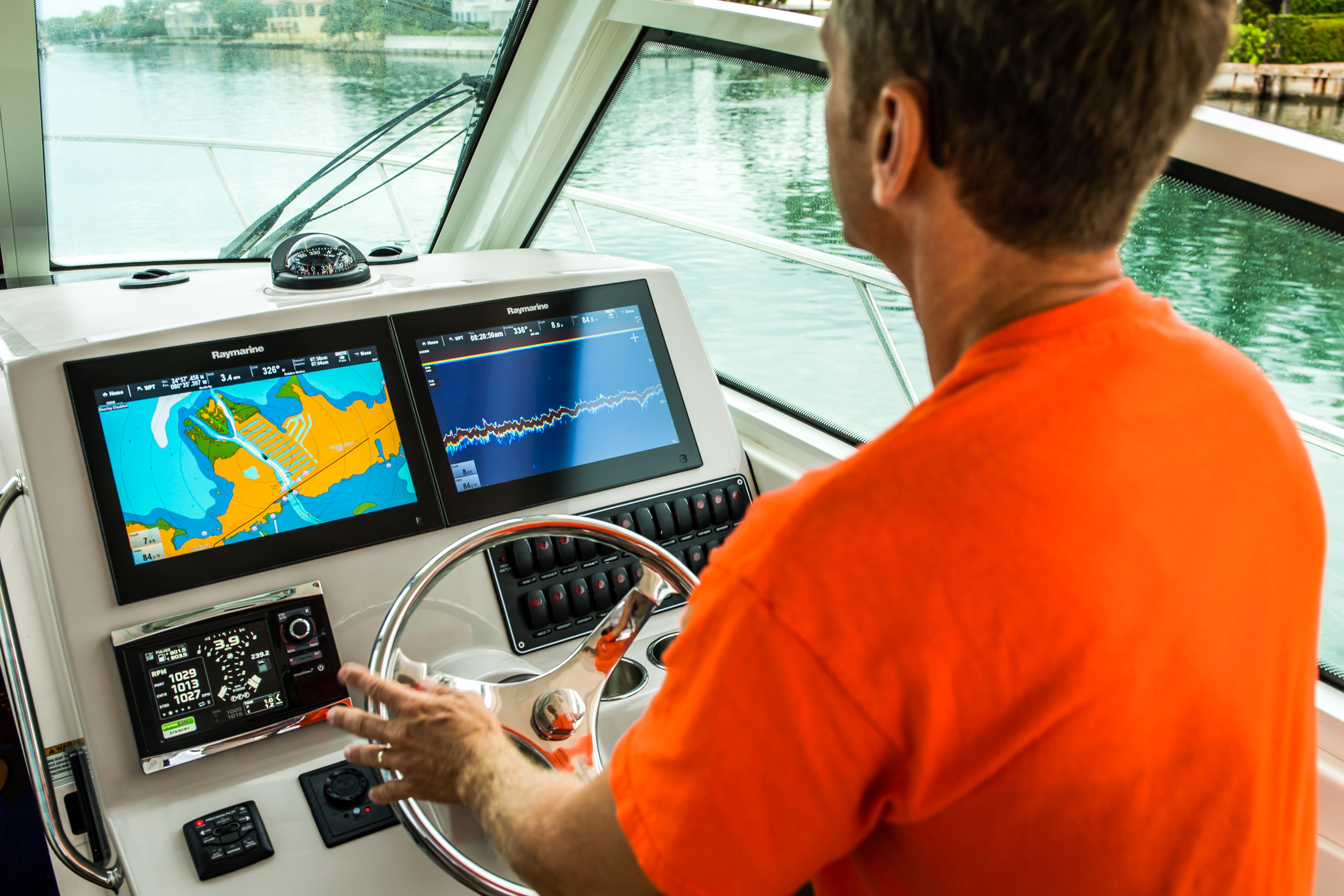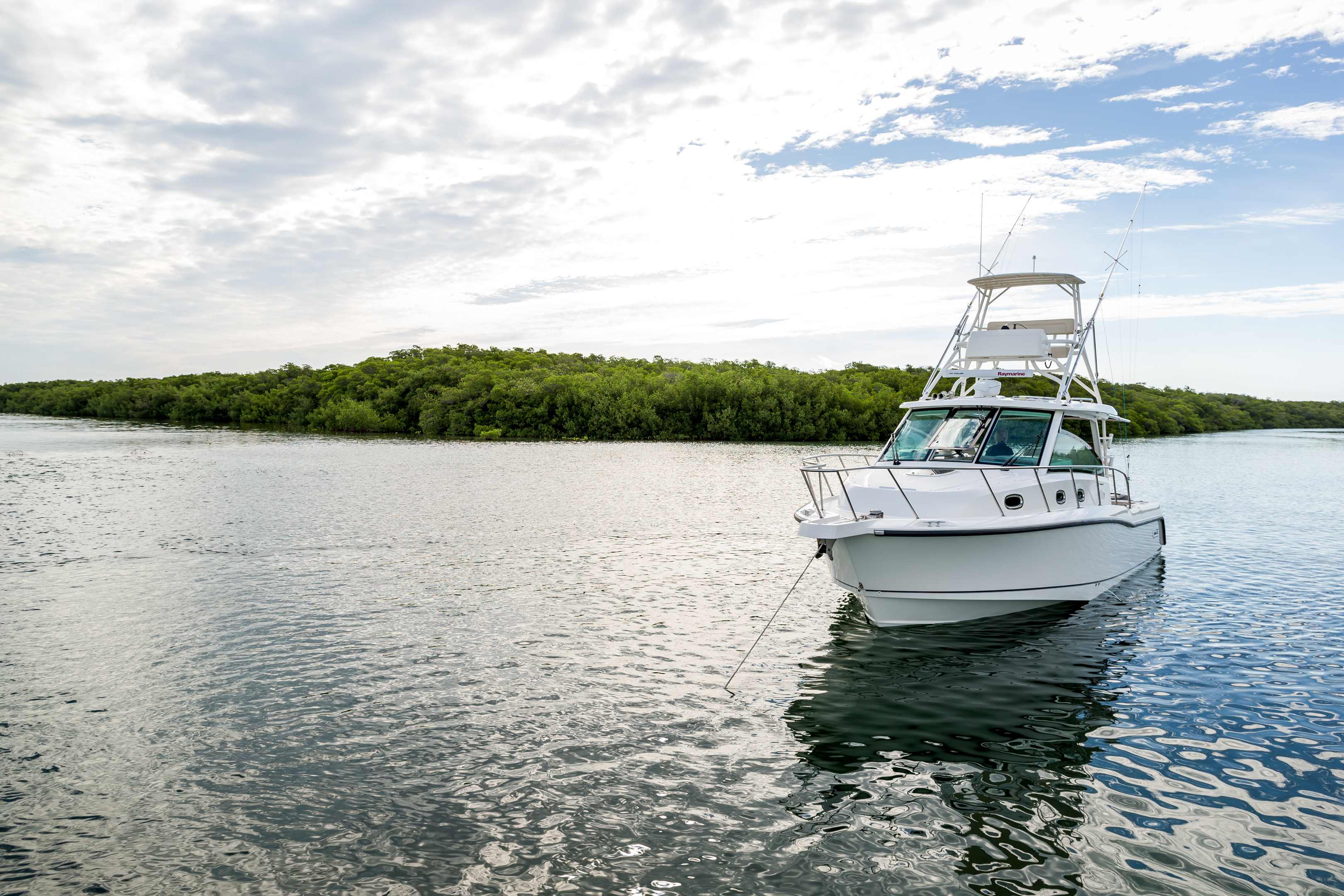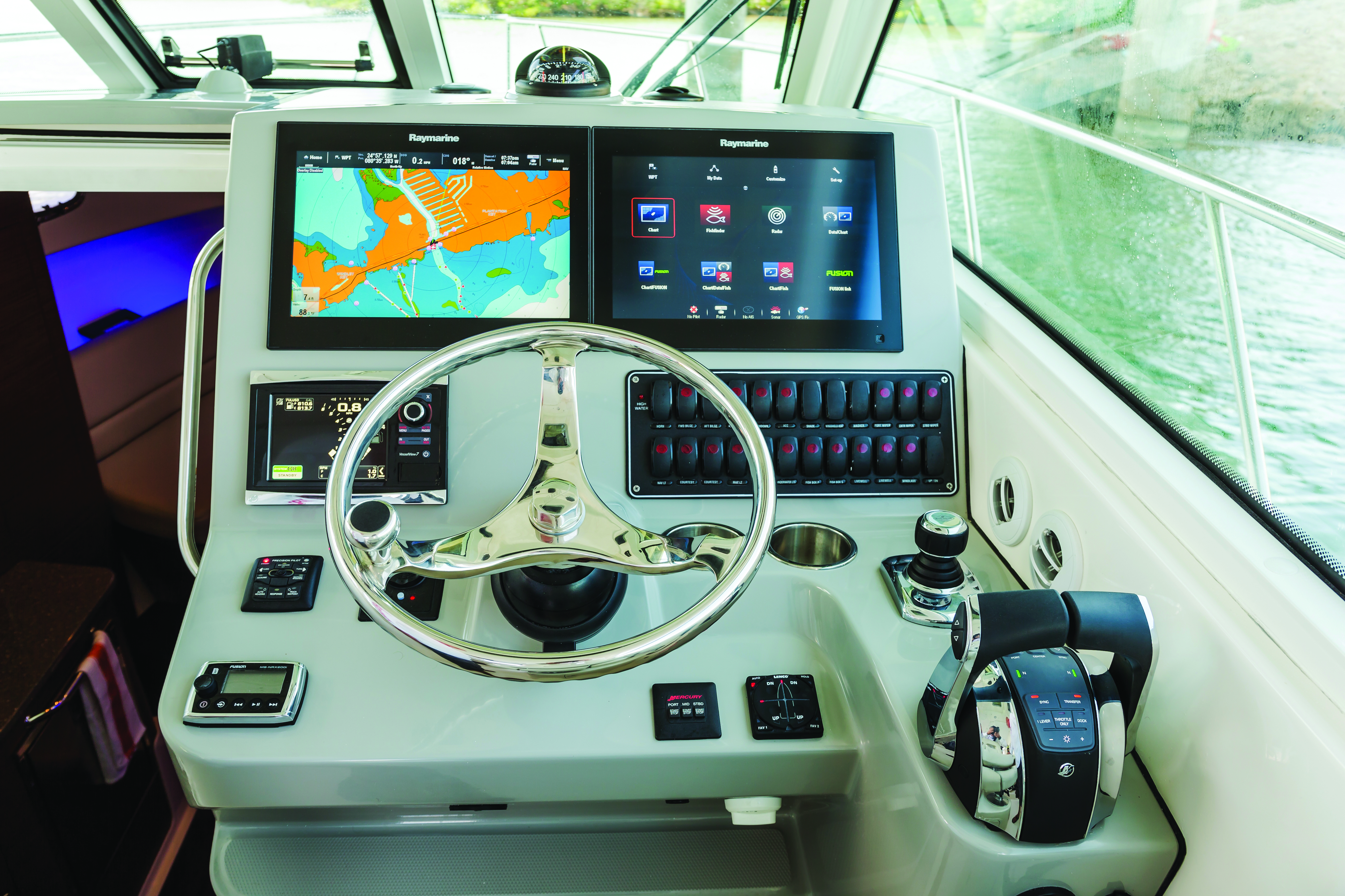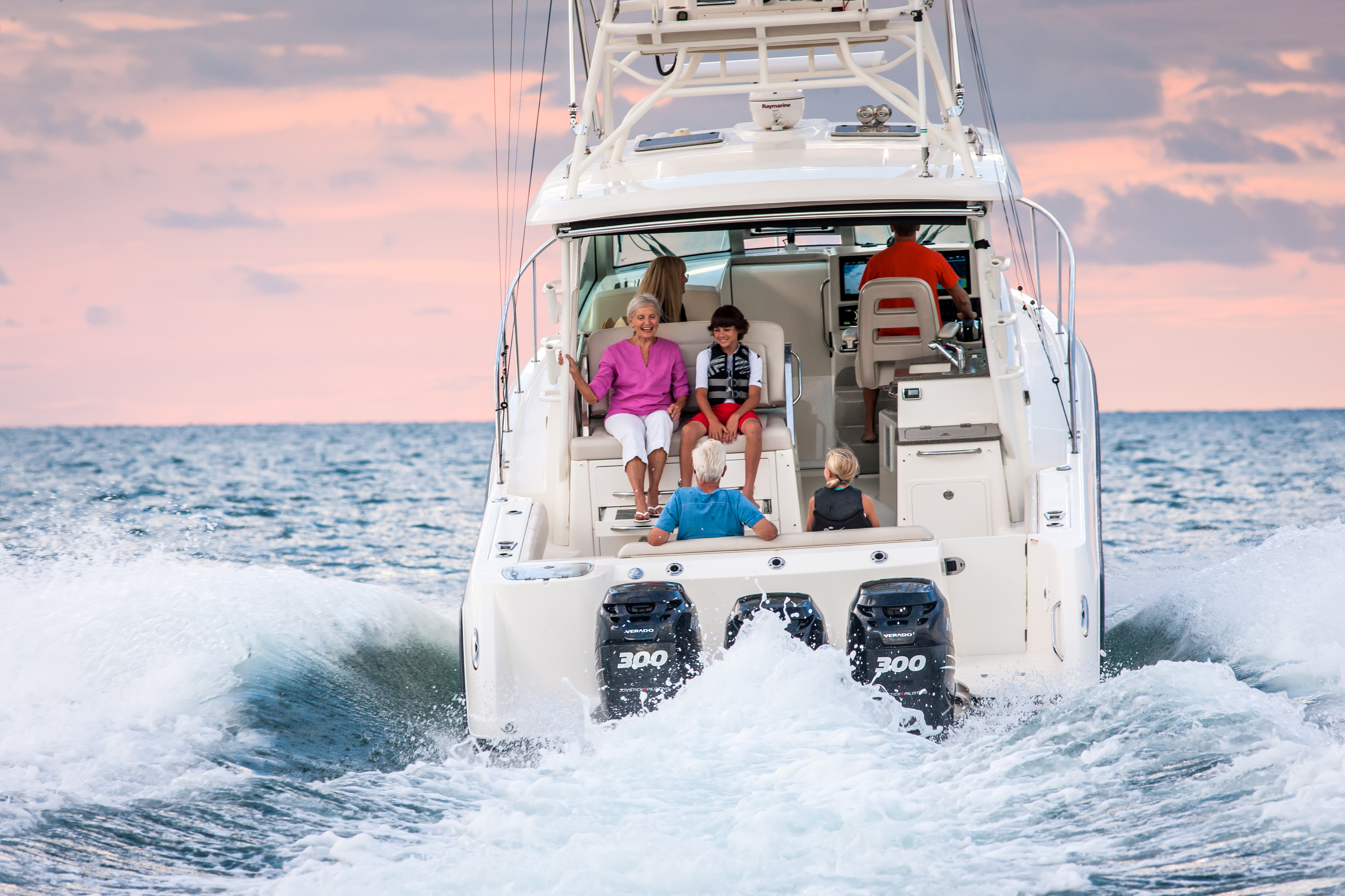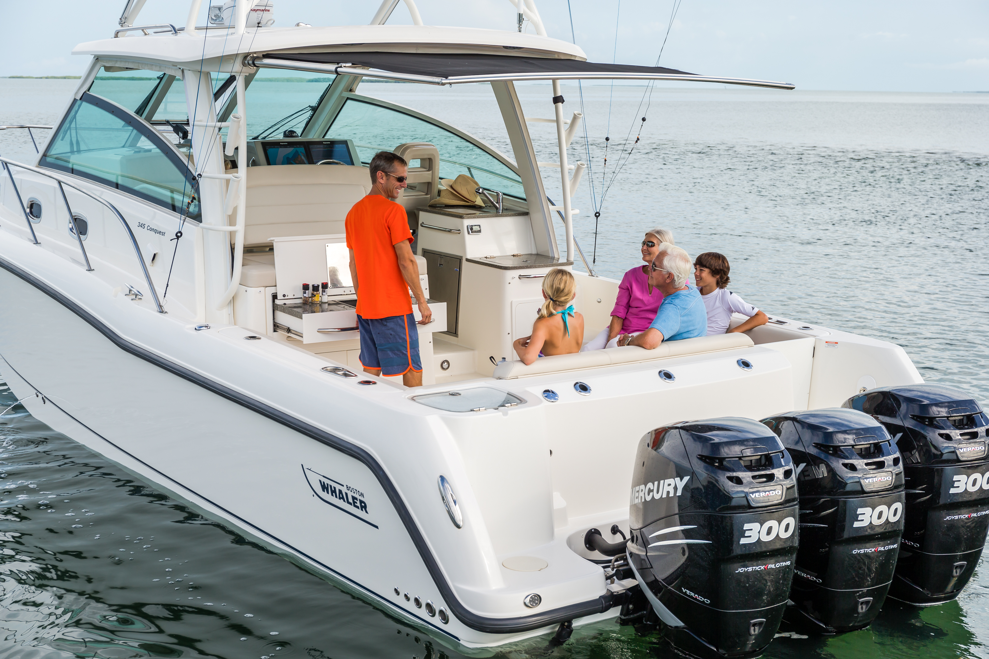 Triple Mercury FourtStroke Verado® engines with Joystick Piloting provide impressive power and control.