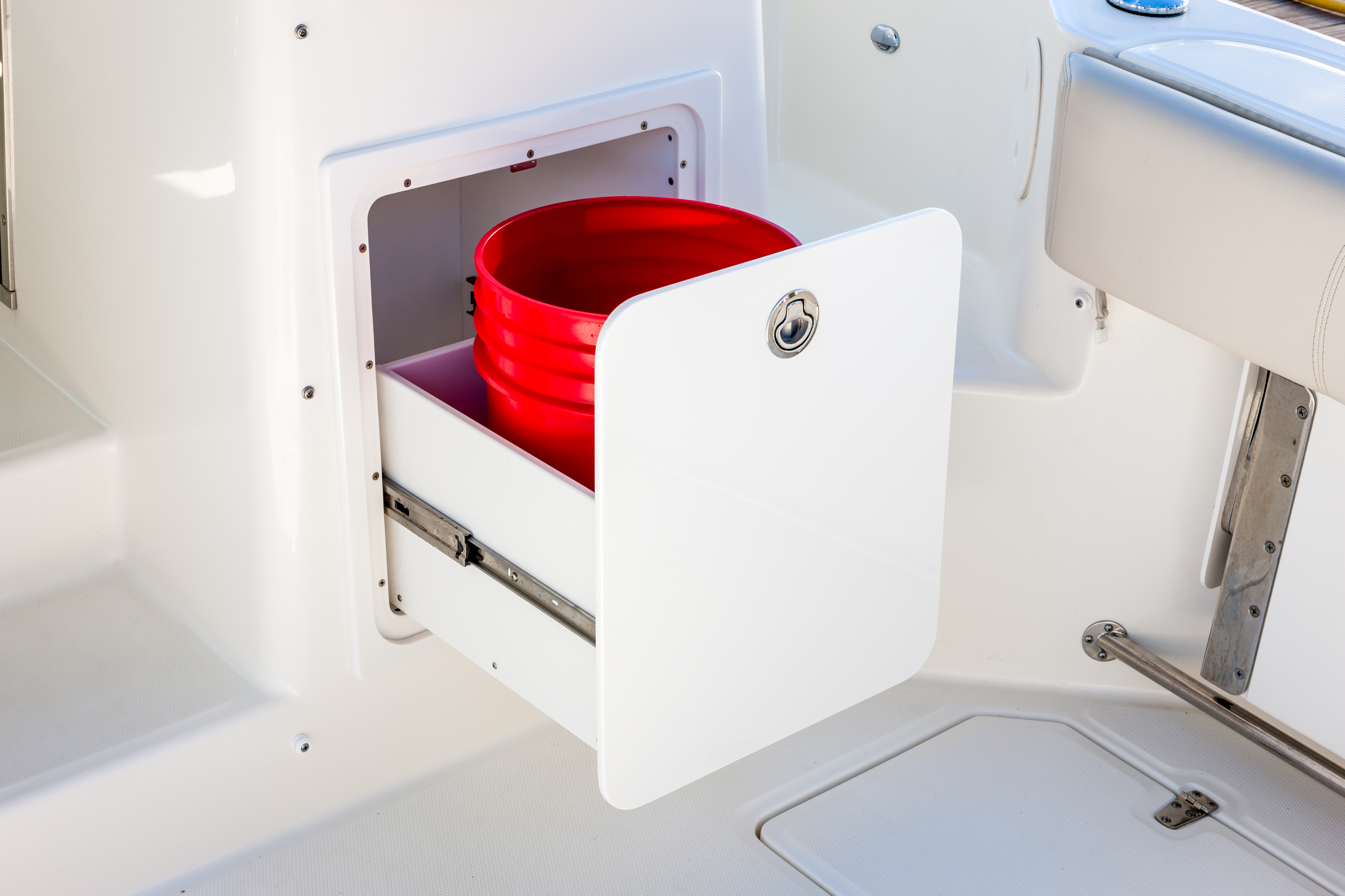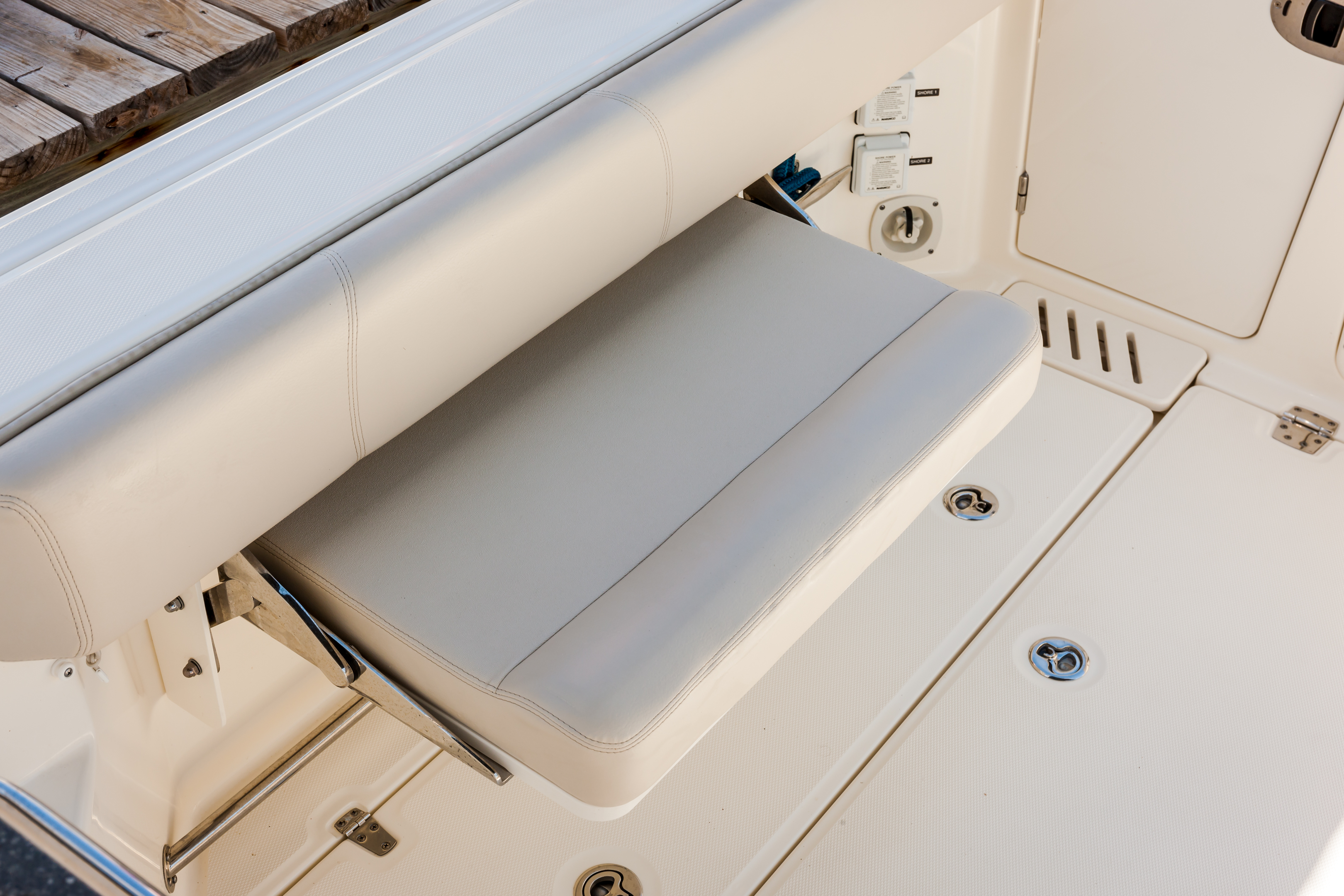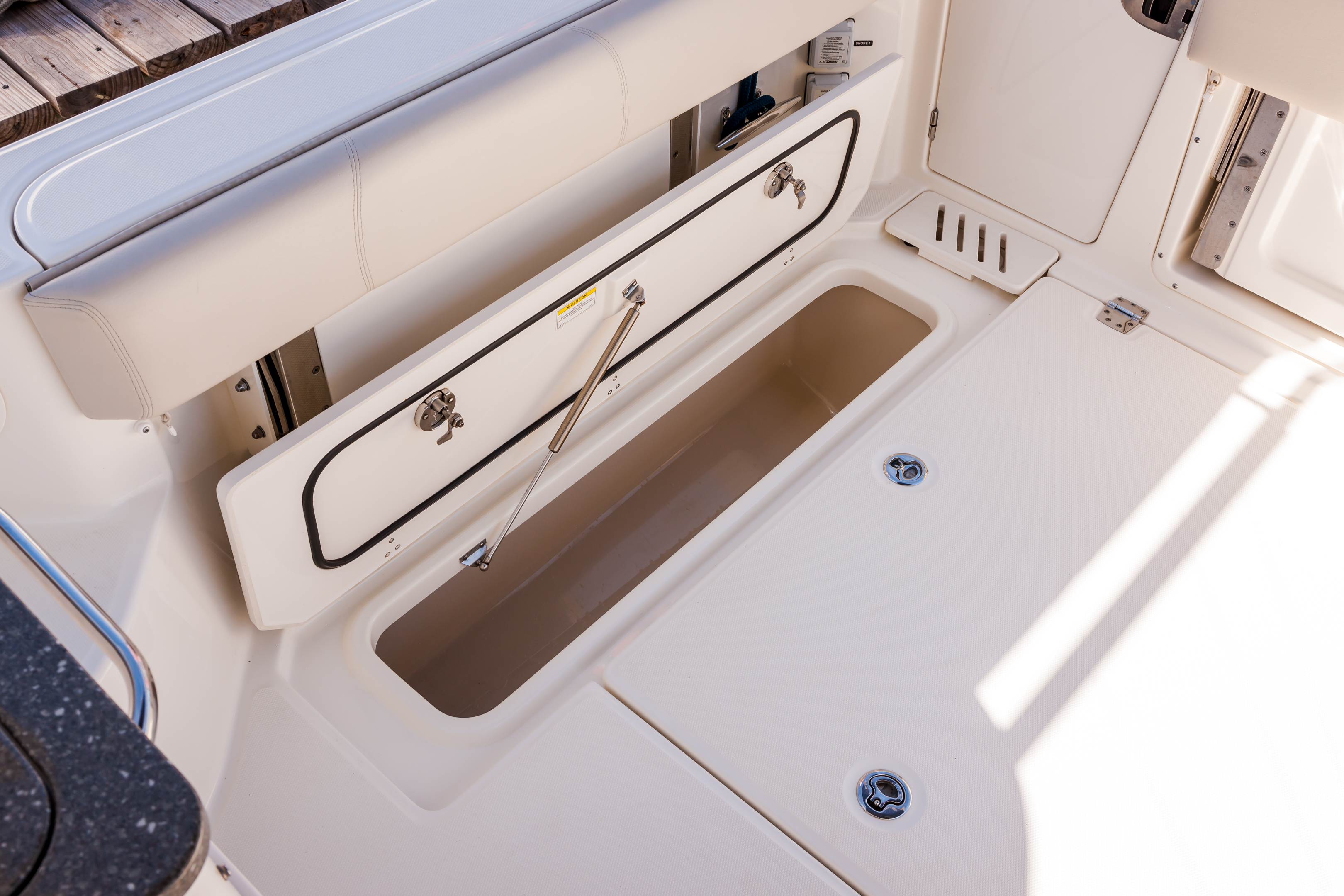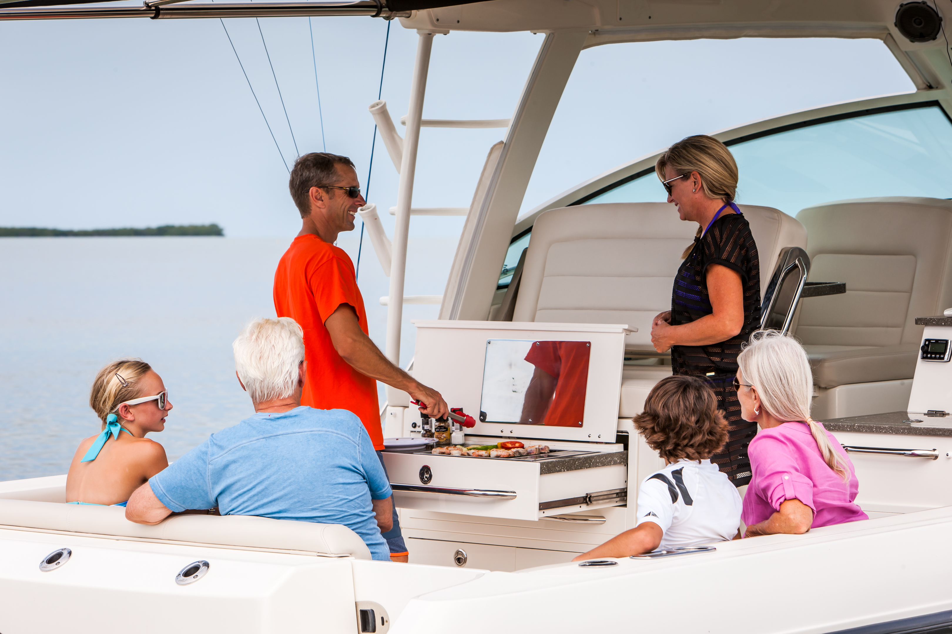 Convenient cockpit prep station with optional flip-top grill, huge storage and YETI® cooler.