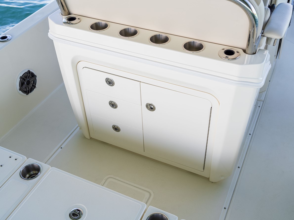 Fishing features include a standard 35-gallon stern livewell, bow fishbox, rod holders and multiple leaning post options.