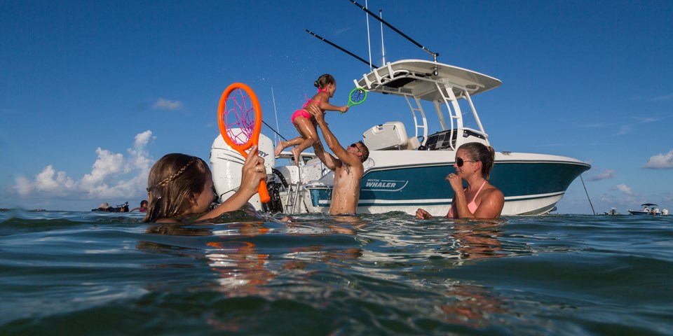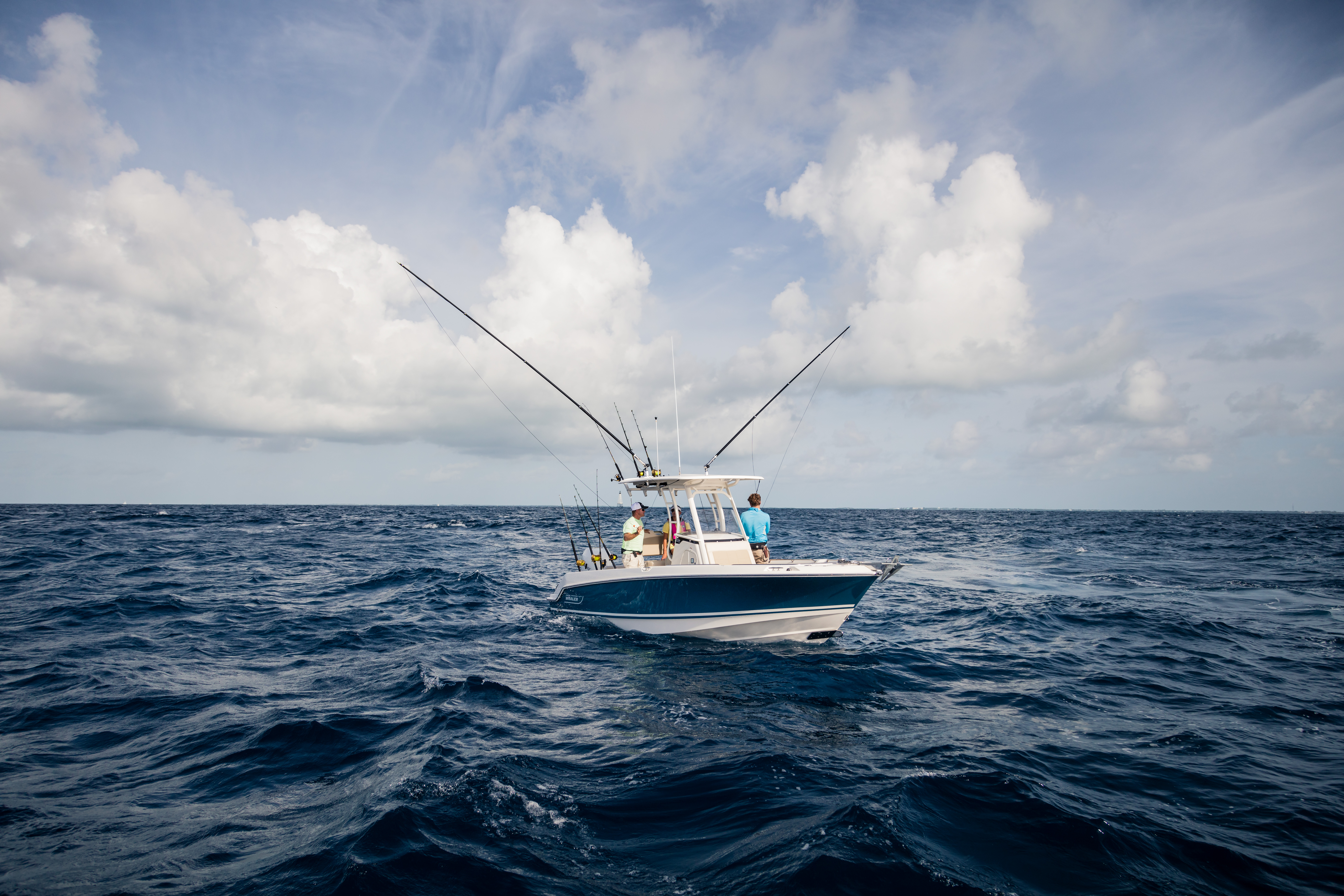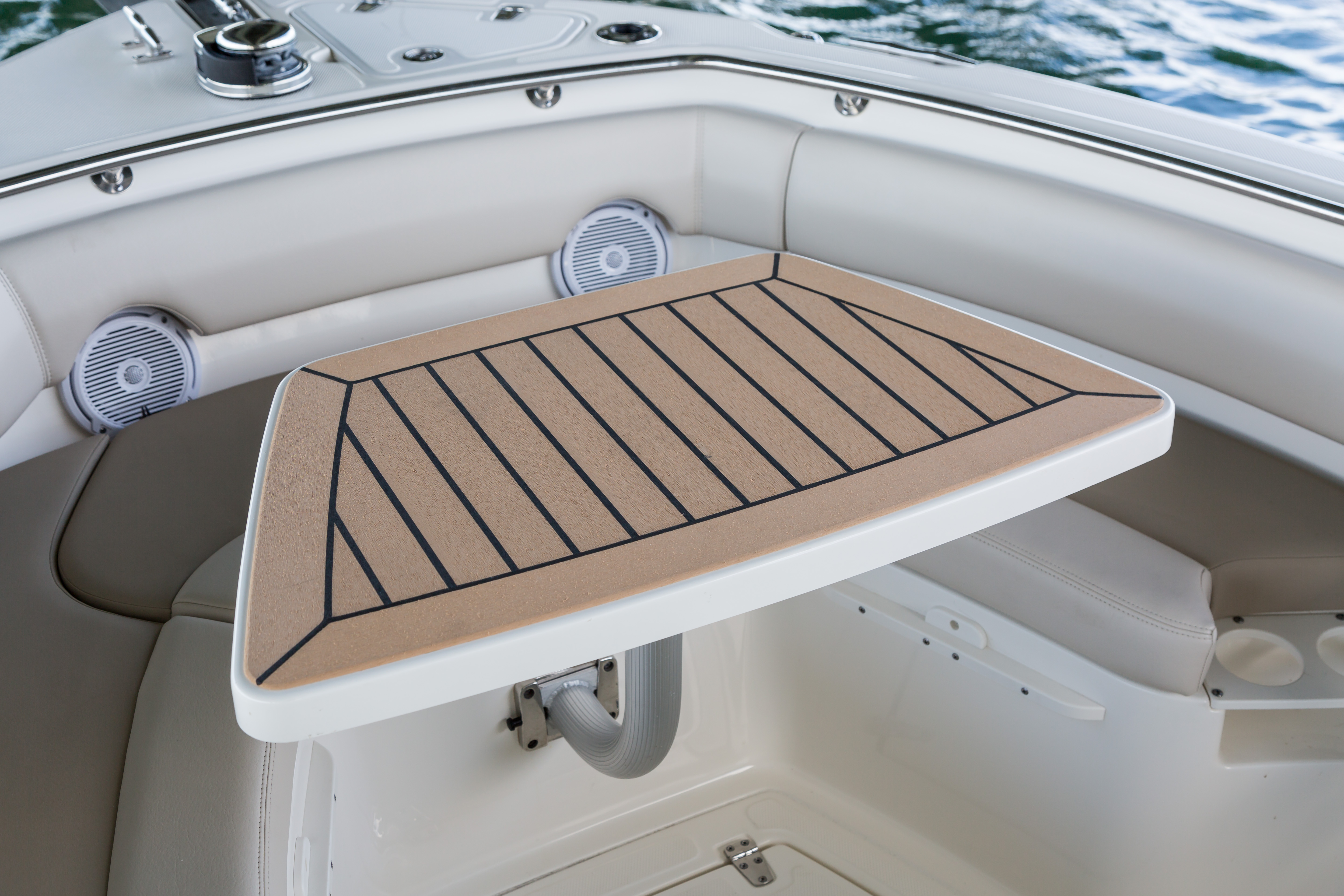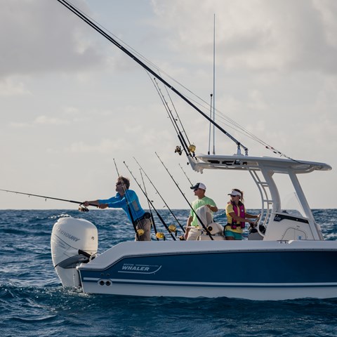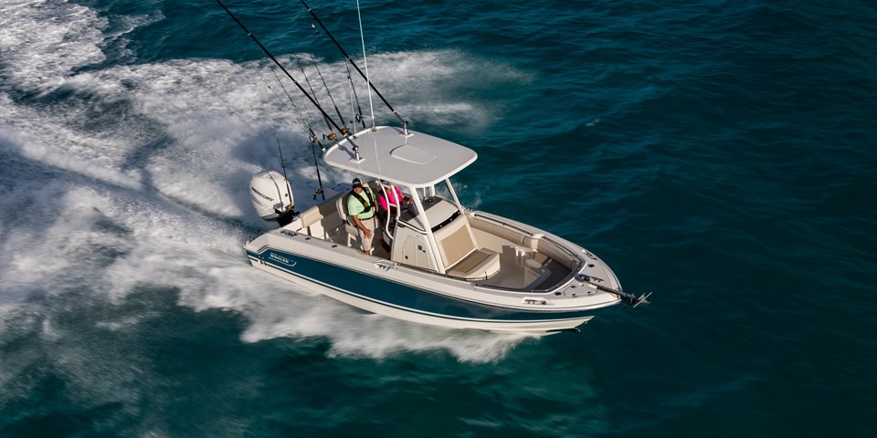 Optional Fishing Package with fishbox pump-out, fishing station, raw-water washdown and transom-mounted rod holders.