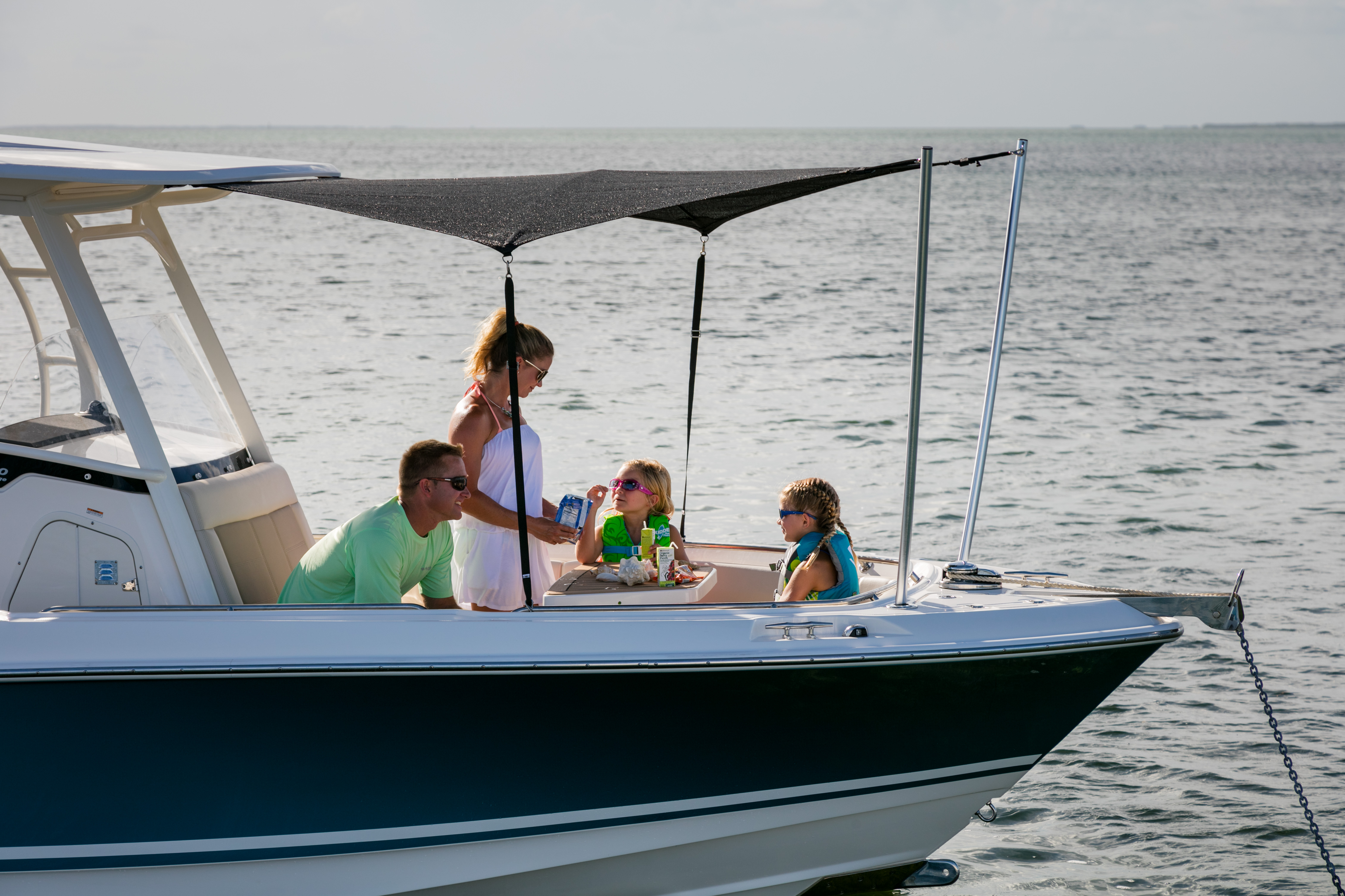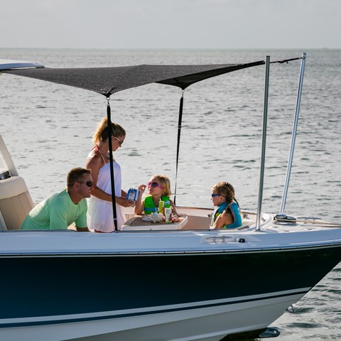 Fold-out stern seat with backrest bolster provides additional comfort for all your crew.