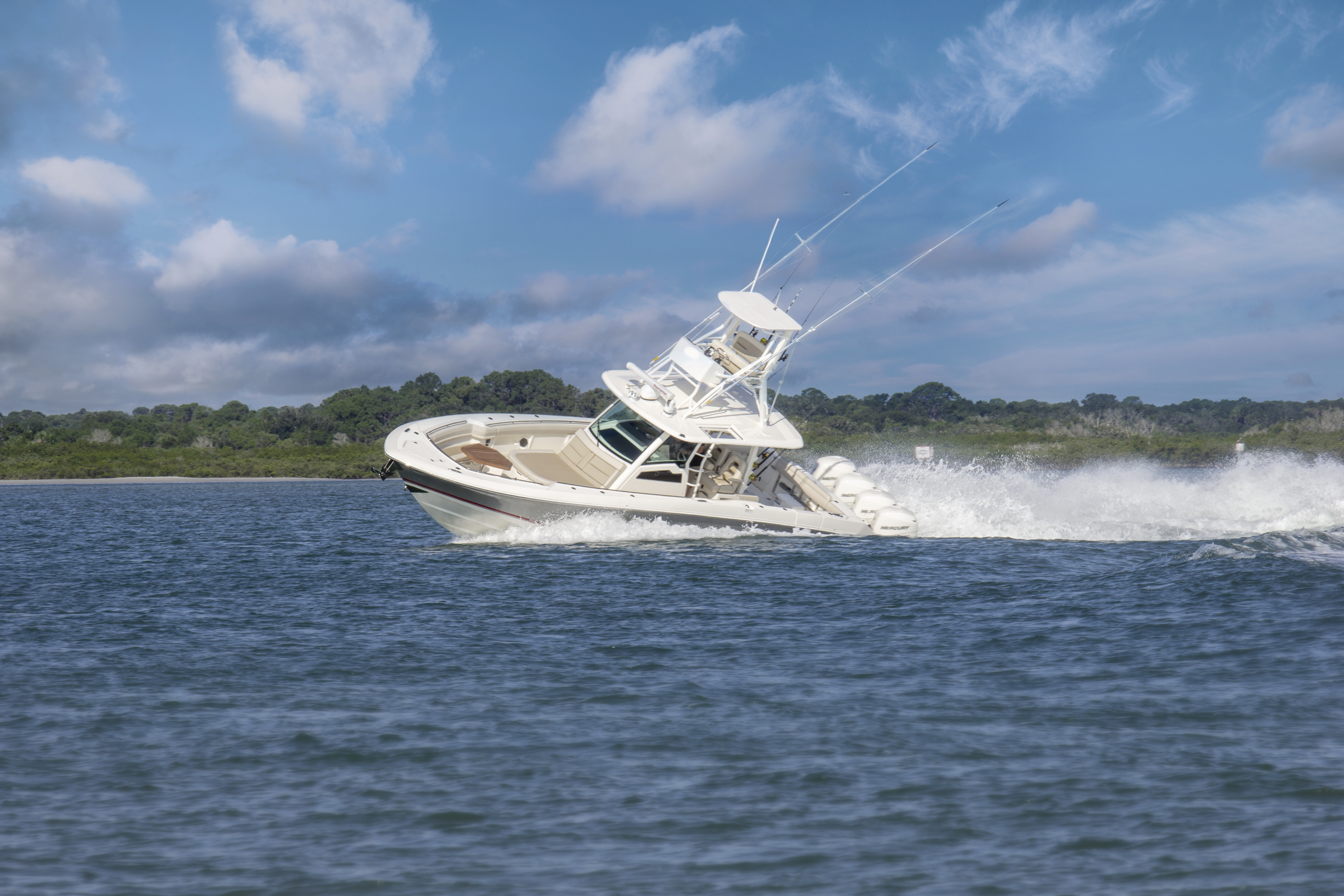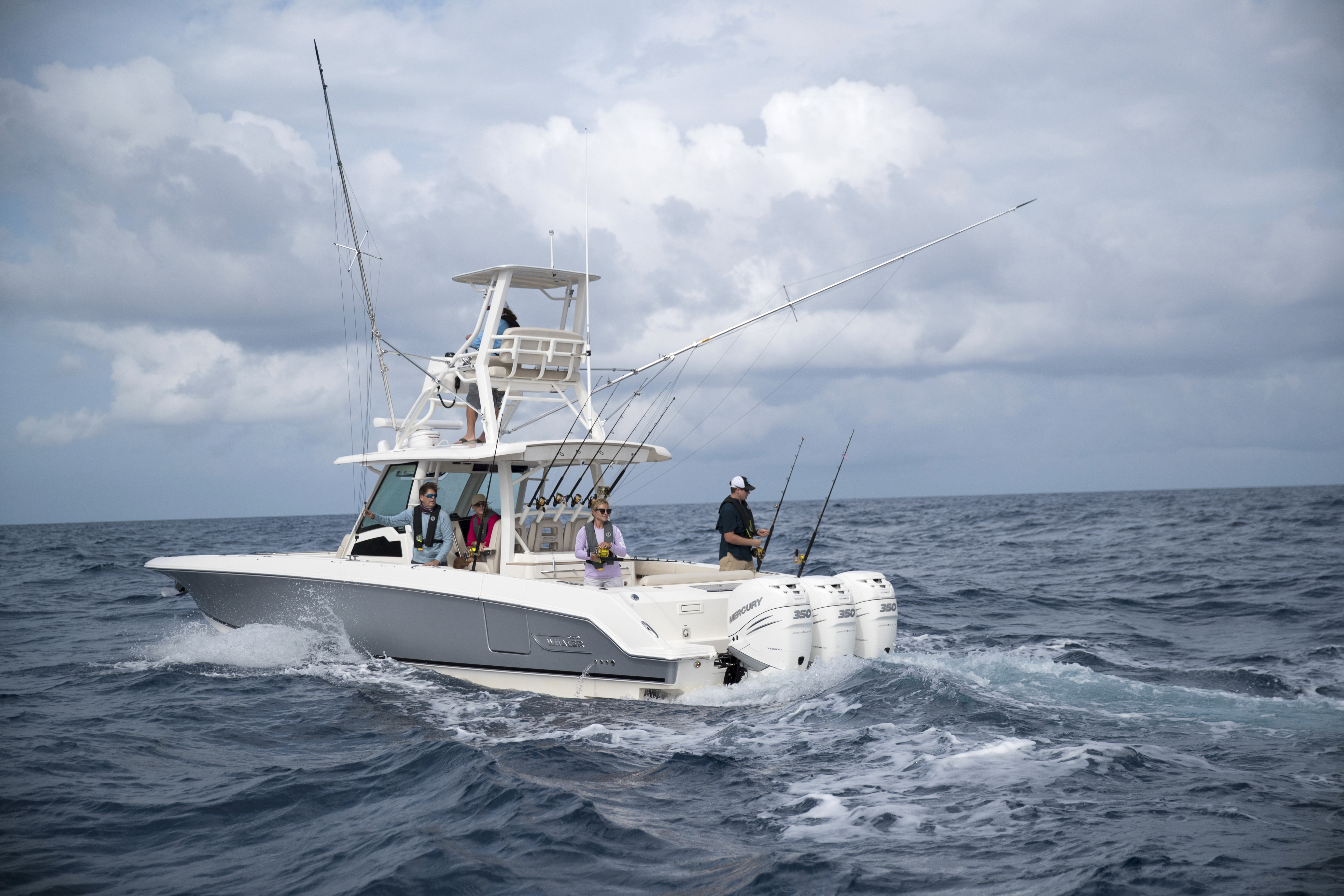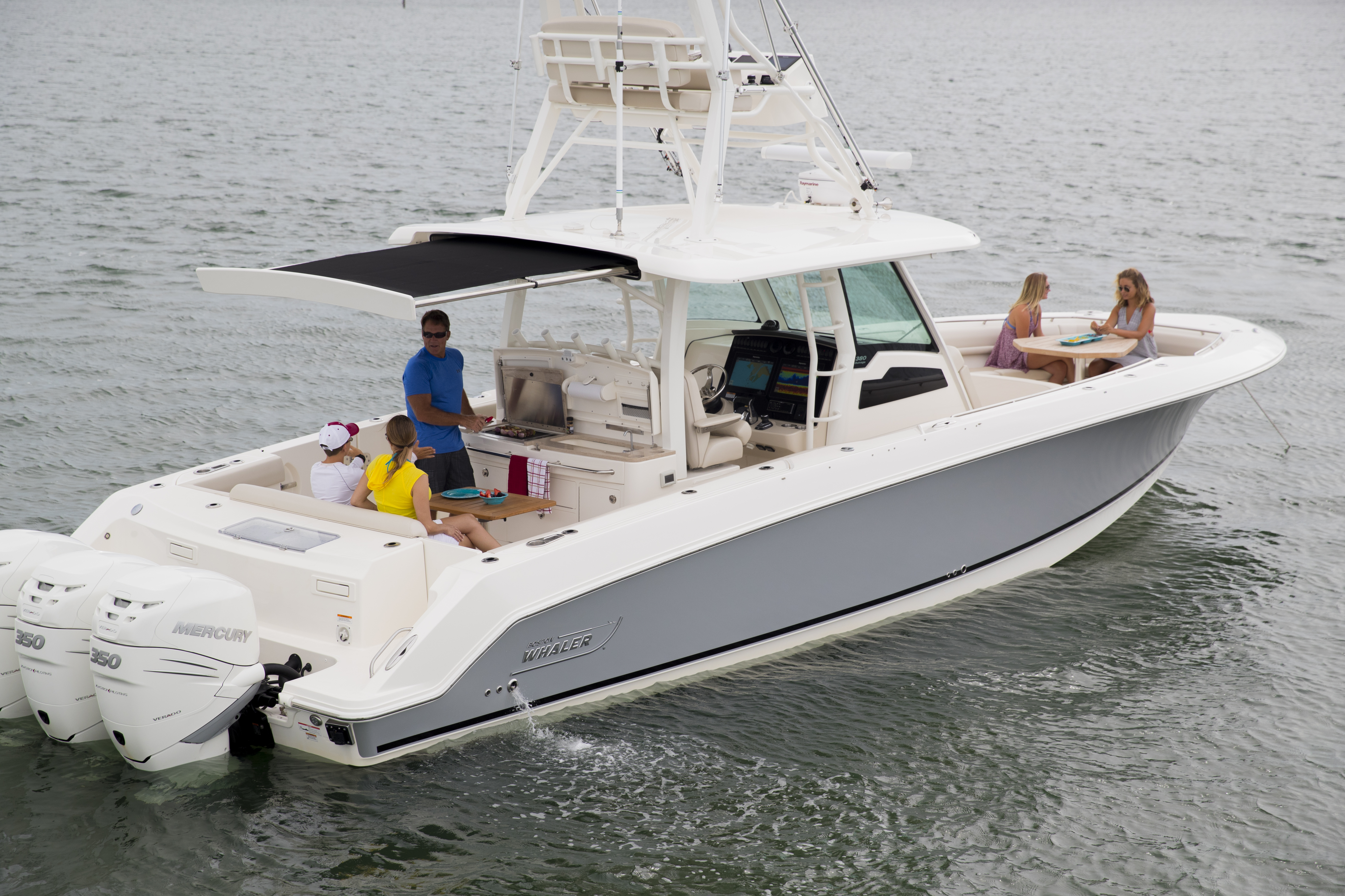 The 380 Outrage® delivers a full-spectrum, pinnacle experience, performing beautifully as an offshore fishing platform, an entertaining vessel, a yacht tender or all of the above. The roomy, notched bow features expansive seating and storage, while the cockpit includes a new aft-facing couch with optional removable table and an optional Summer Kitchen, perfect for entertaining friends and family. Boston Whaler's precision-engineered hull and Mercury® engines work together to provide remarkable efficiency, reliability and smooth, predictable handling. Experience true Confidence to the Core with the 380 Outrage.
