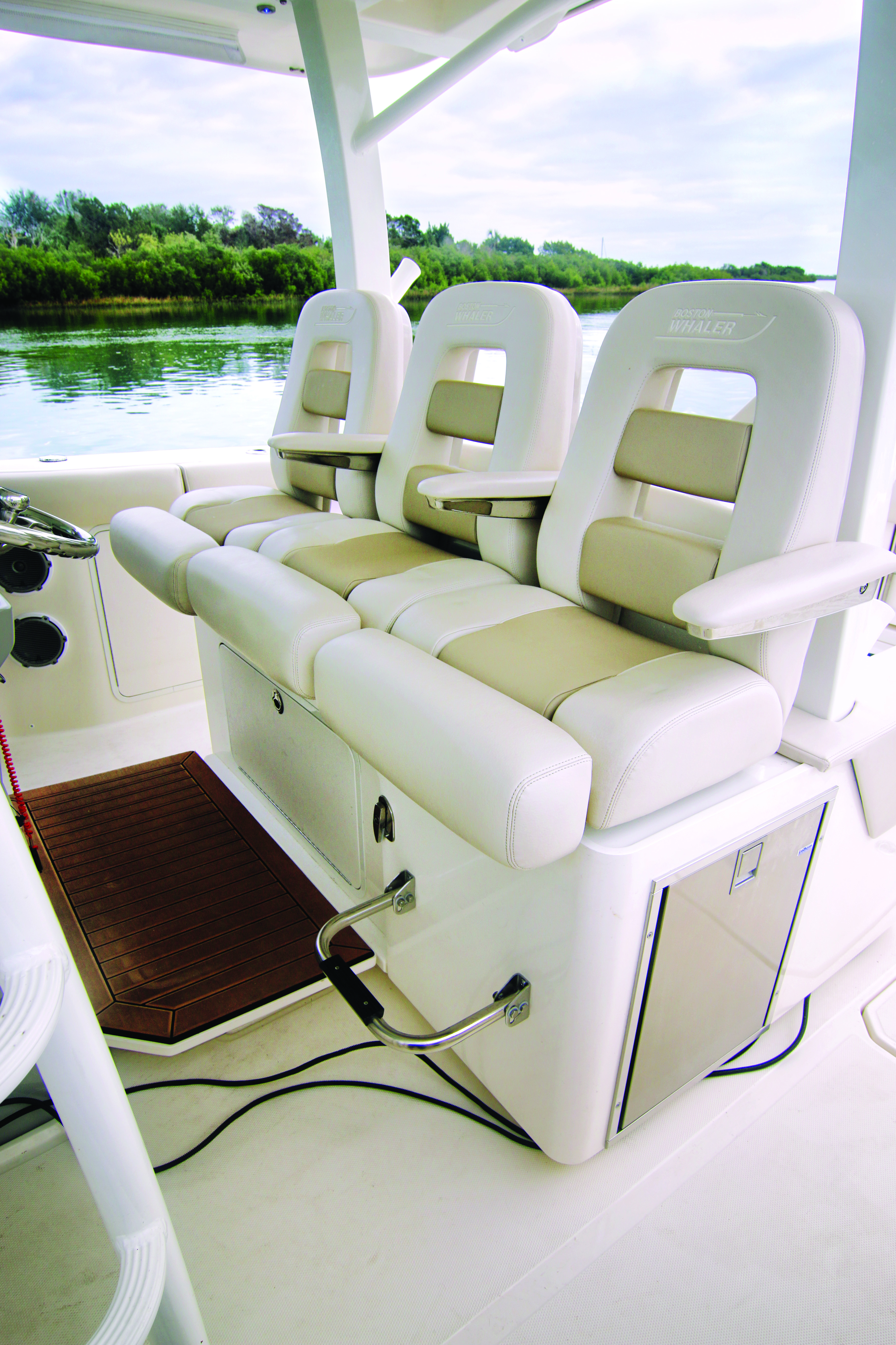 Air-conditioned helm deck boasts seating for the captain and two companions with bolsters and fold-down arm rests.
