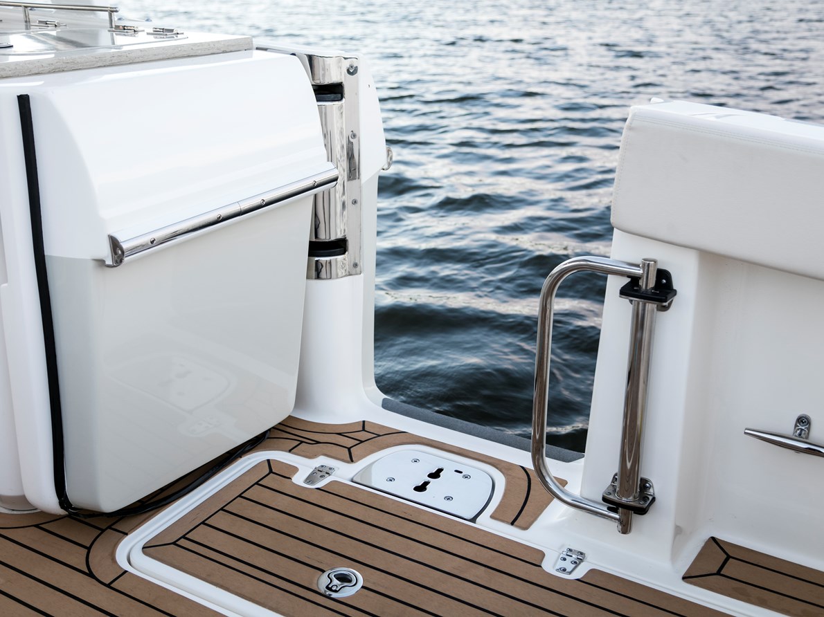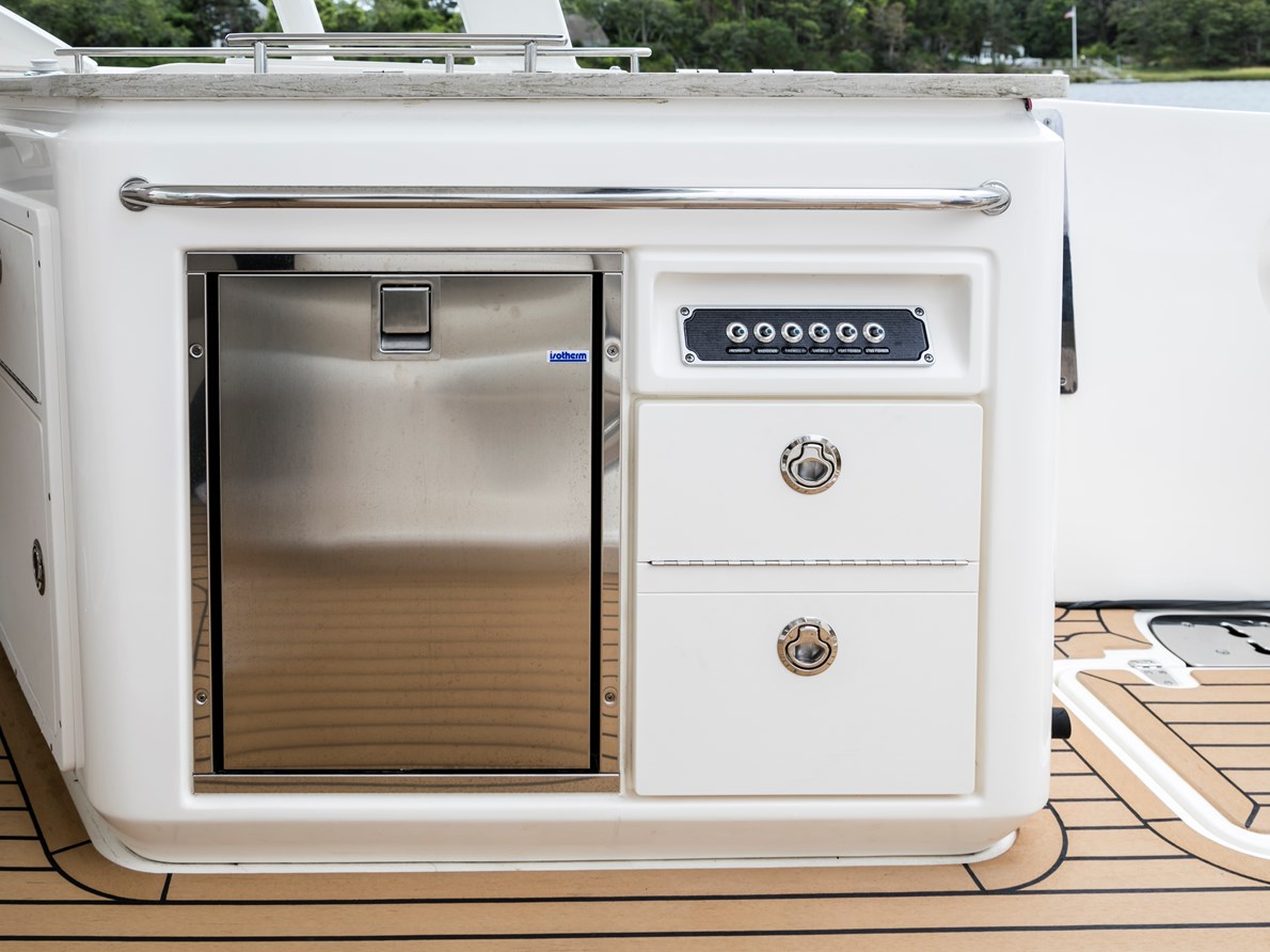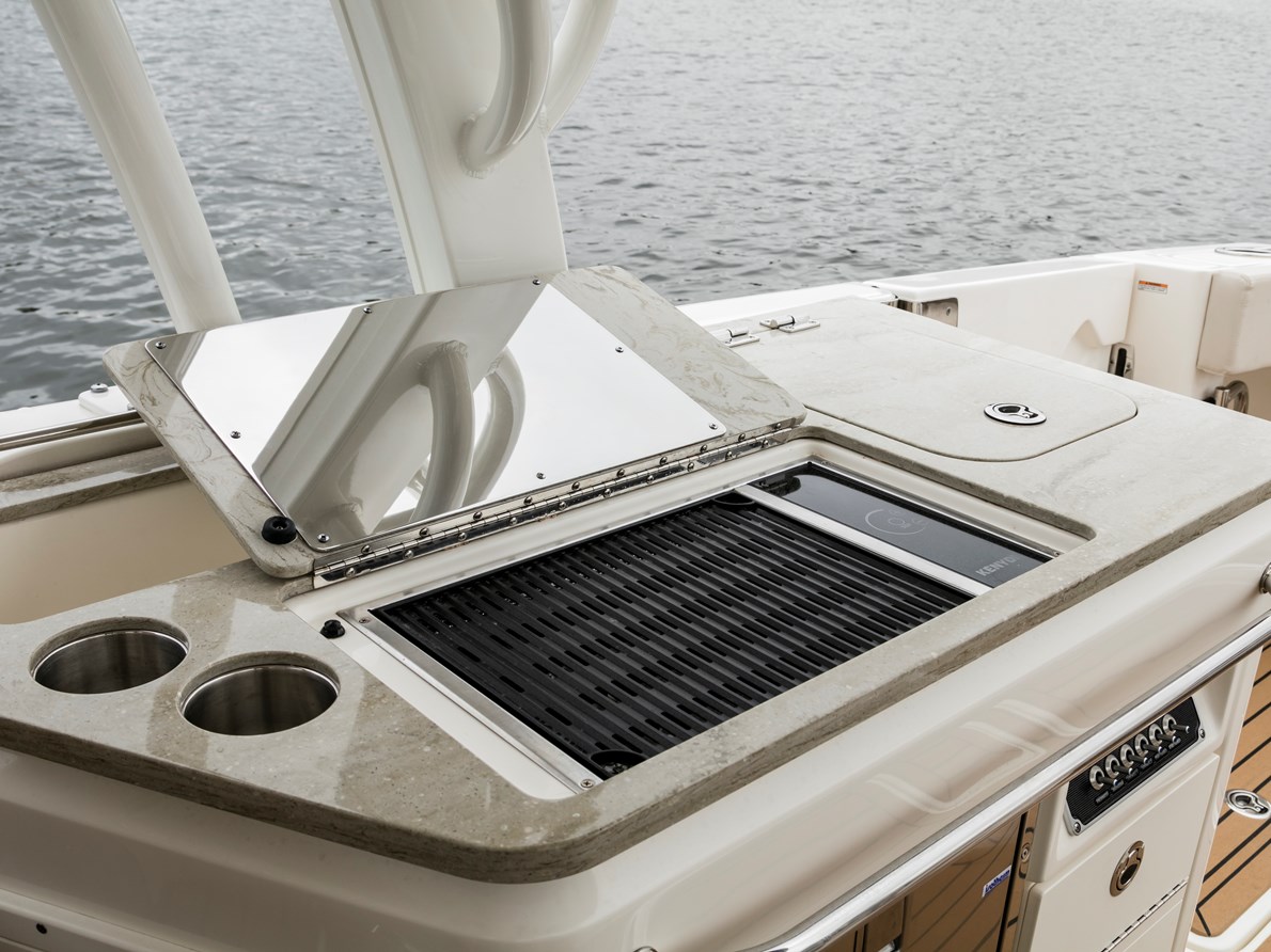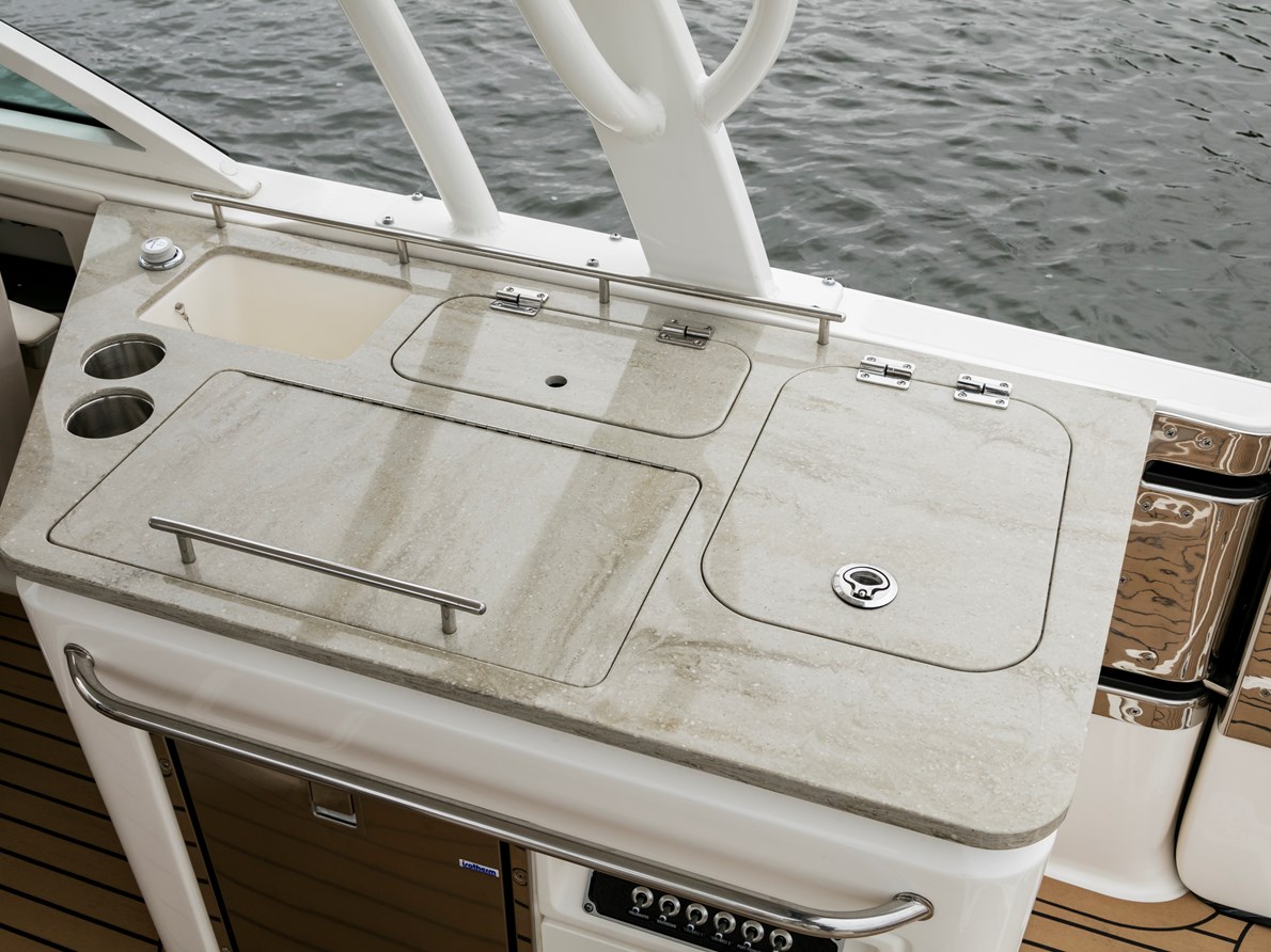 A cockpit utility center includes a sink, 18-gallon cooler and prep surface, plus optional grill and fridge.