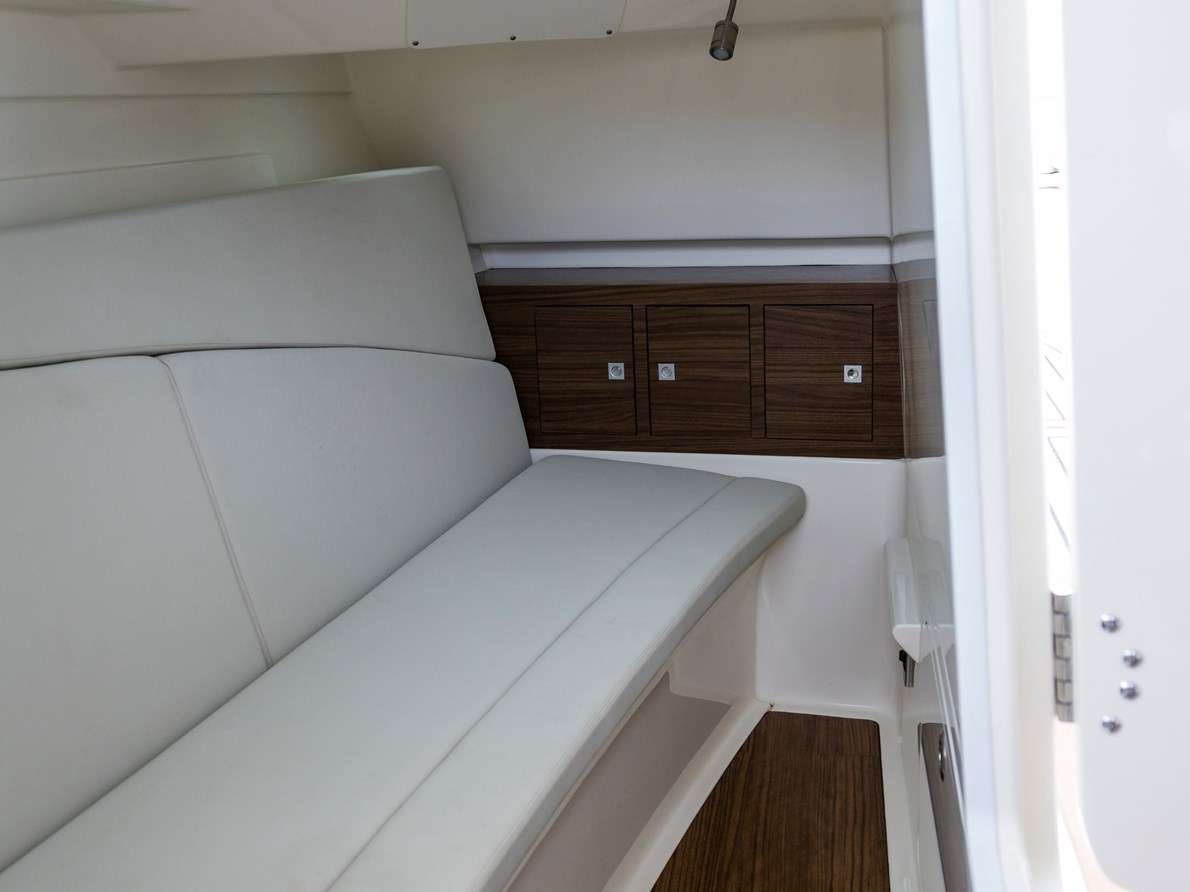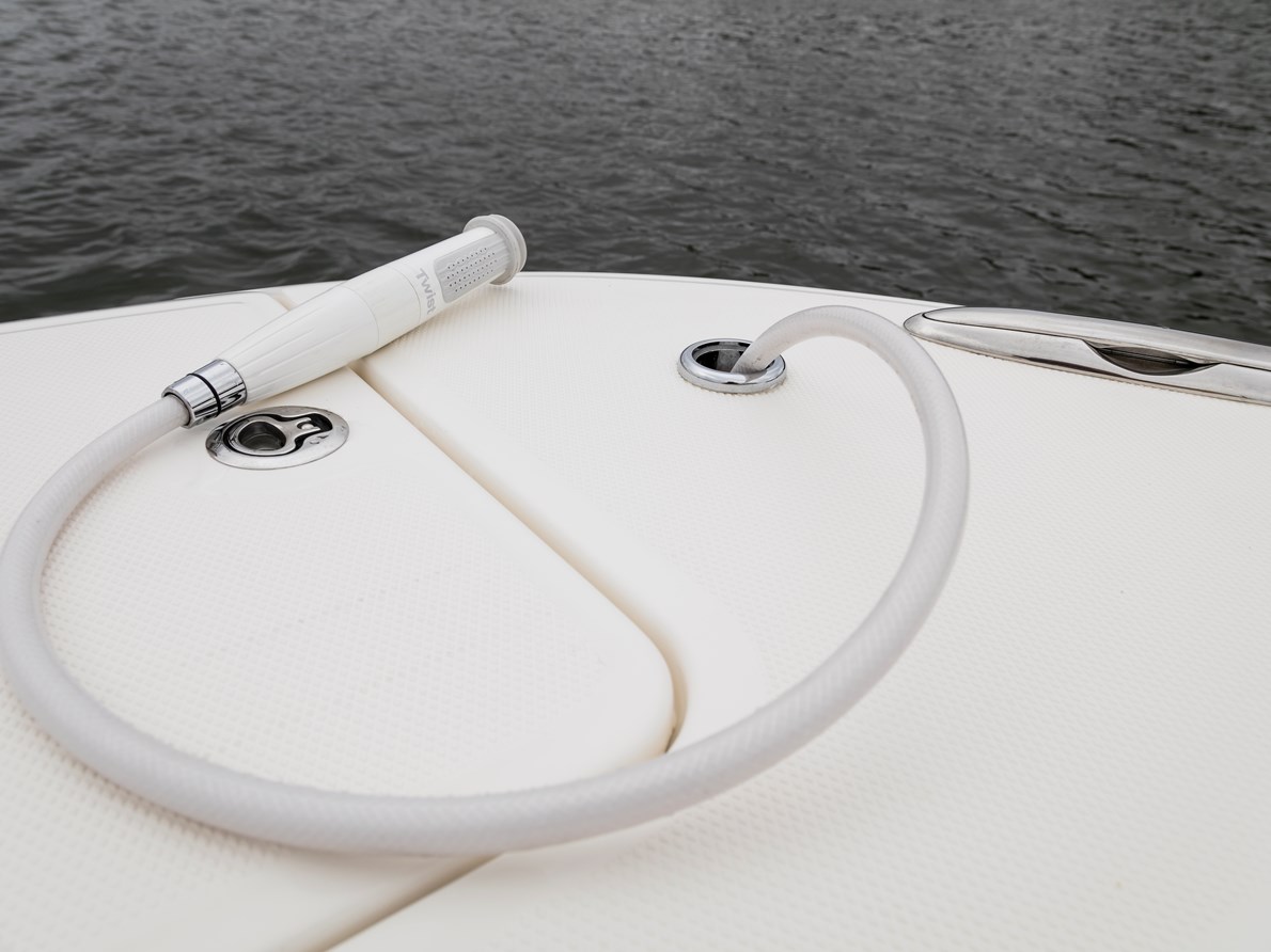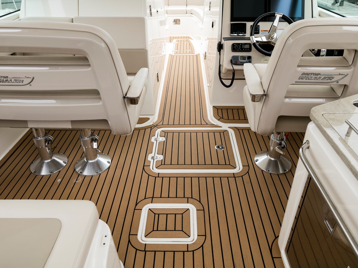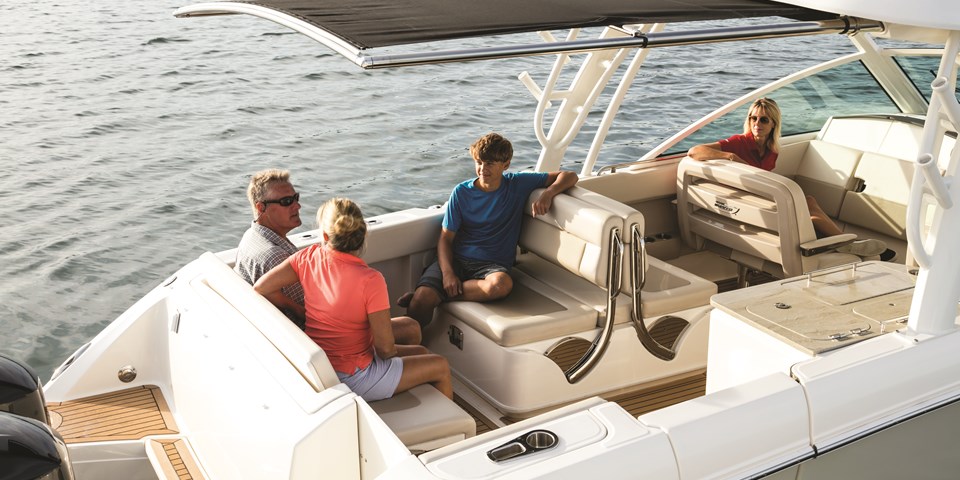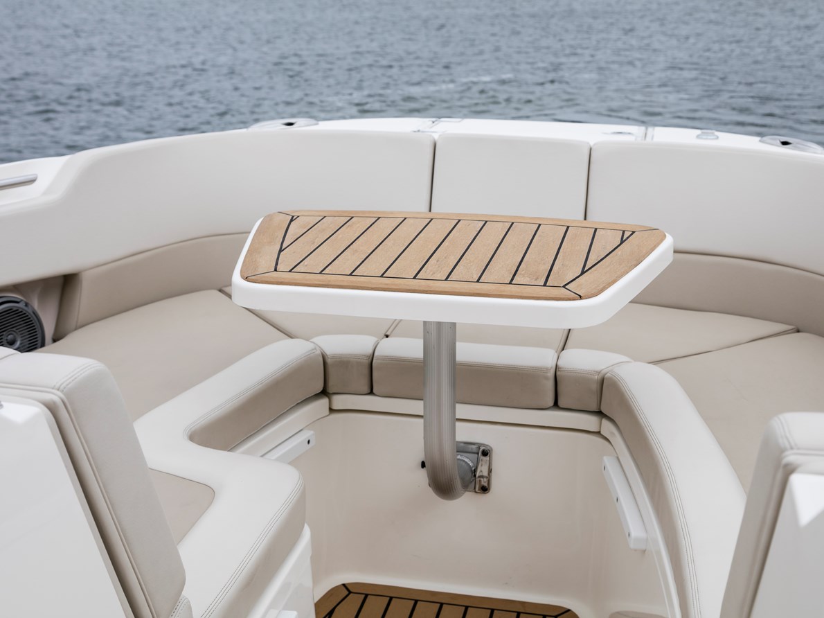 A cockpit utility center includes a sink, 18-gallon cooler and prep surface, plus optional grill and fridge.