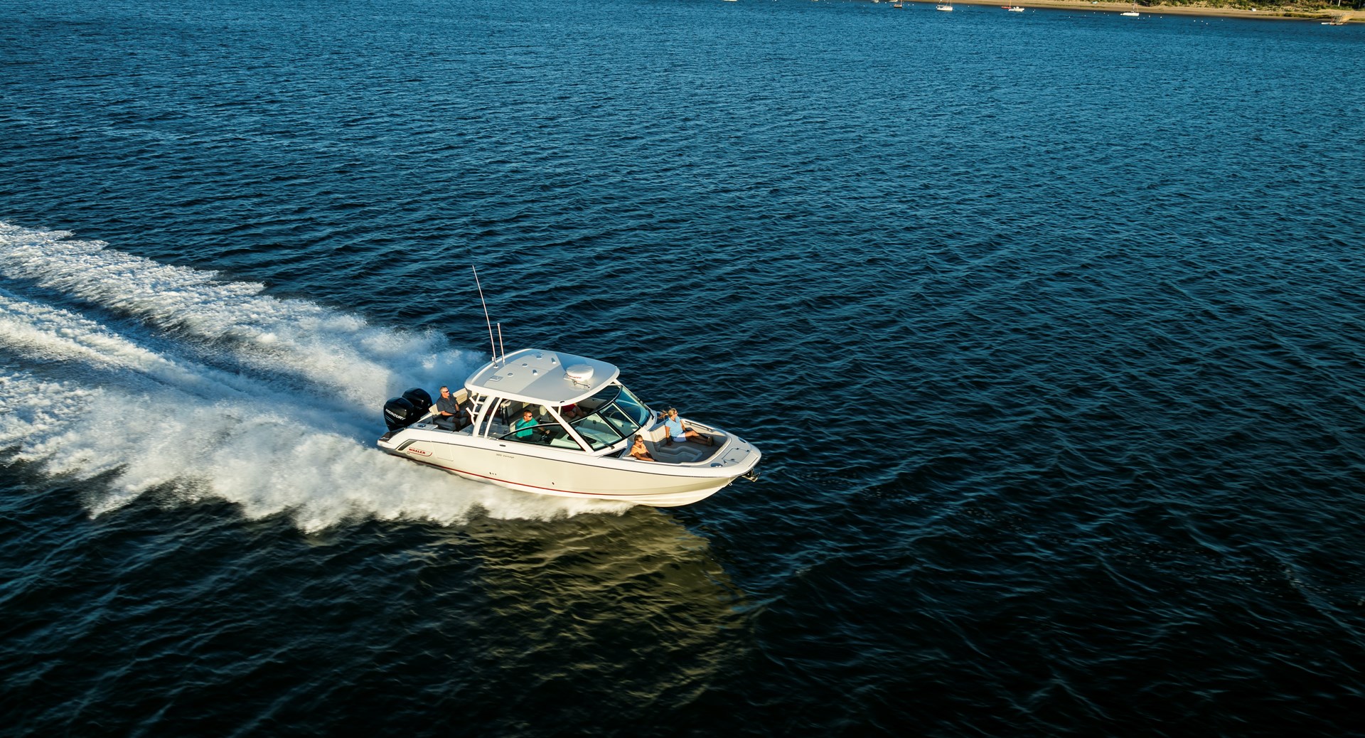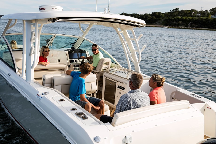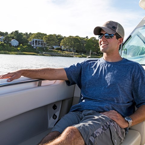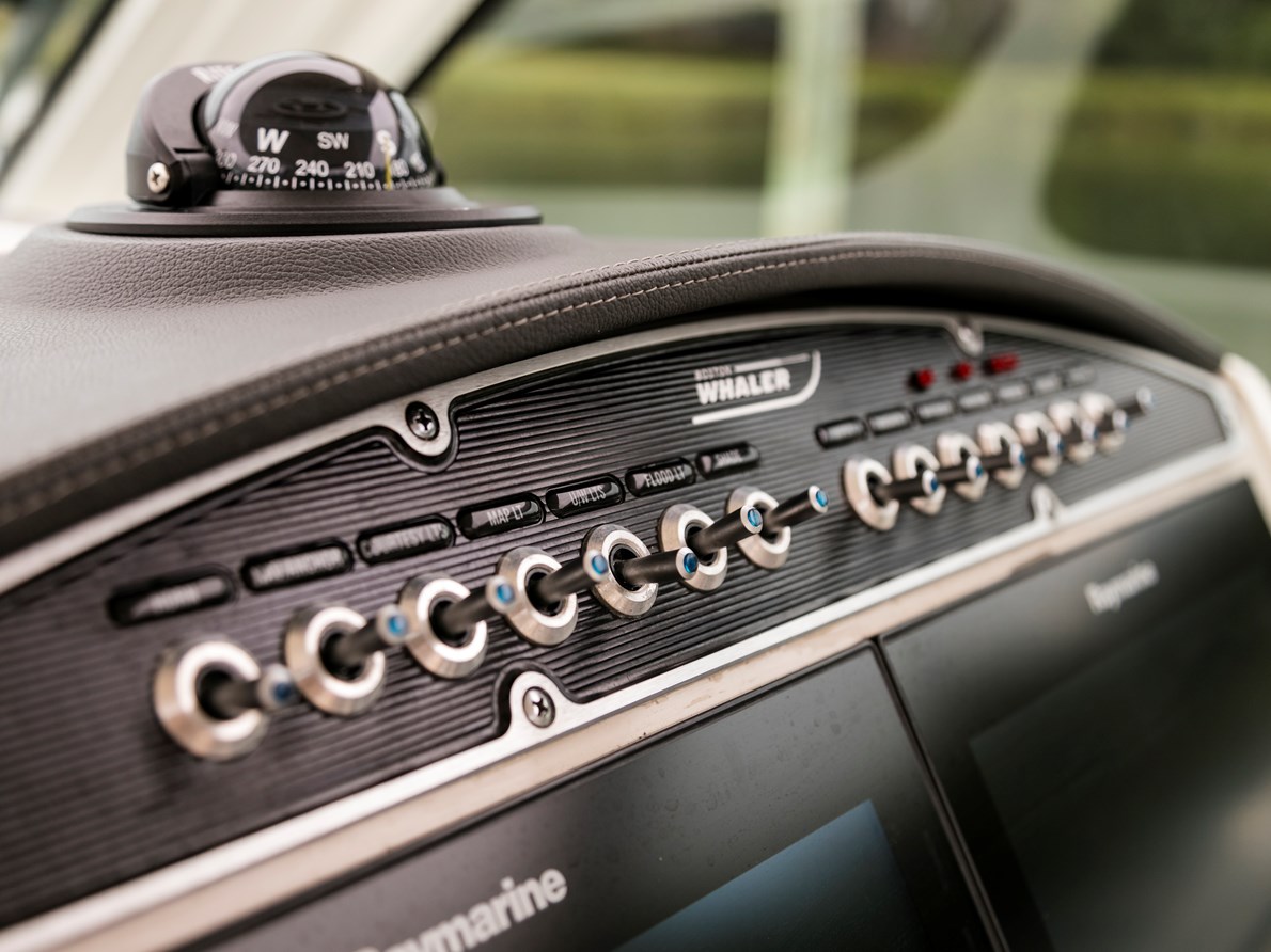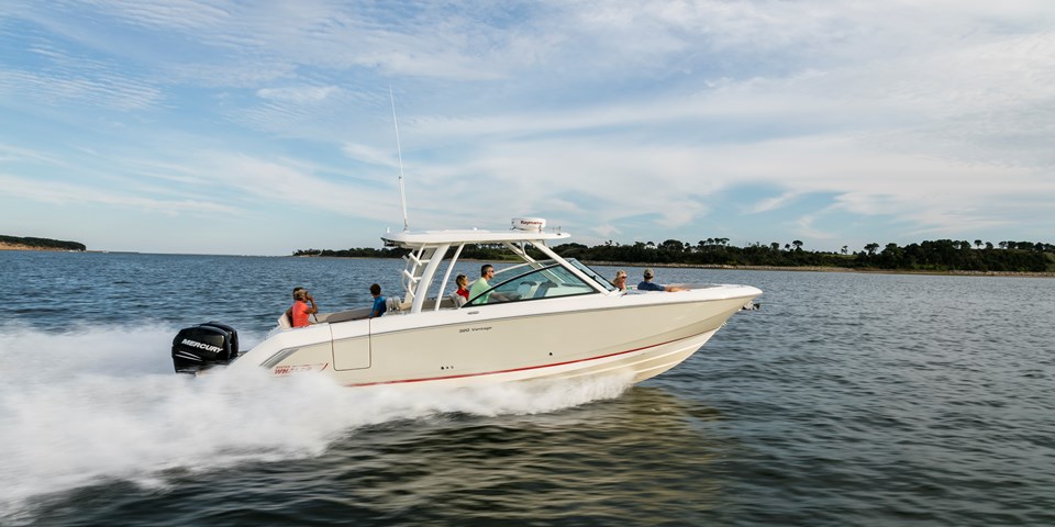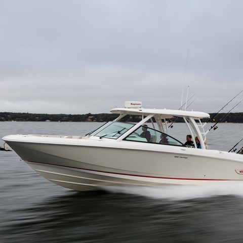 Cutting-edge features, great capacity and easy adaptability are hallmarks of the dual-console 320 Vantage®, winner of the National Marine Manufacturers Association's Innovation Award for it's convertible seating. Rock-solid control meets the ultimate in versatility and comfort with the many accessories and options the 320 provides. Serious fishing, joyful entertaining, day-long watersports or cruising and even a place to sneak in a nap or an overnight stay, the 320 is ready for your day. When the softest, safest ride meets the best equipped dual-console around, new possibilities become eminently possible. With Whaler, you can be confident to the core.