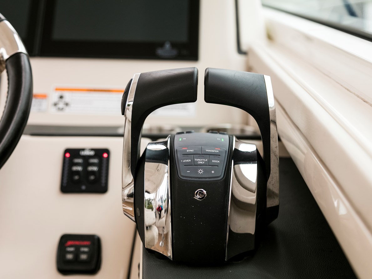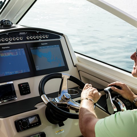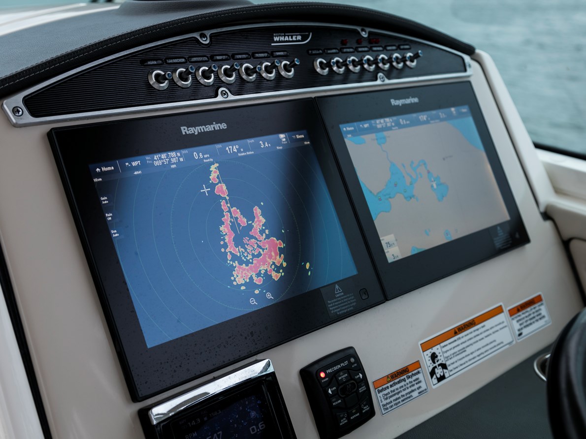 Two touchscreens at the helm feature available Raymarine® electronics and VesselView display.