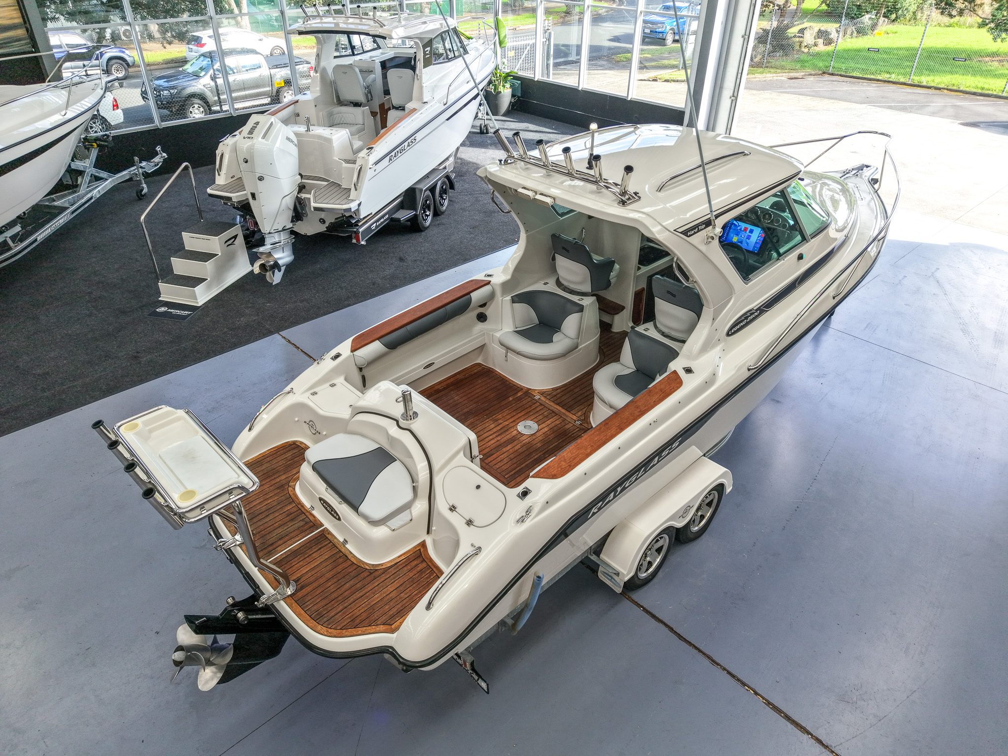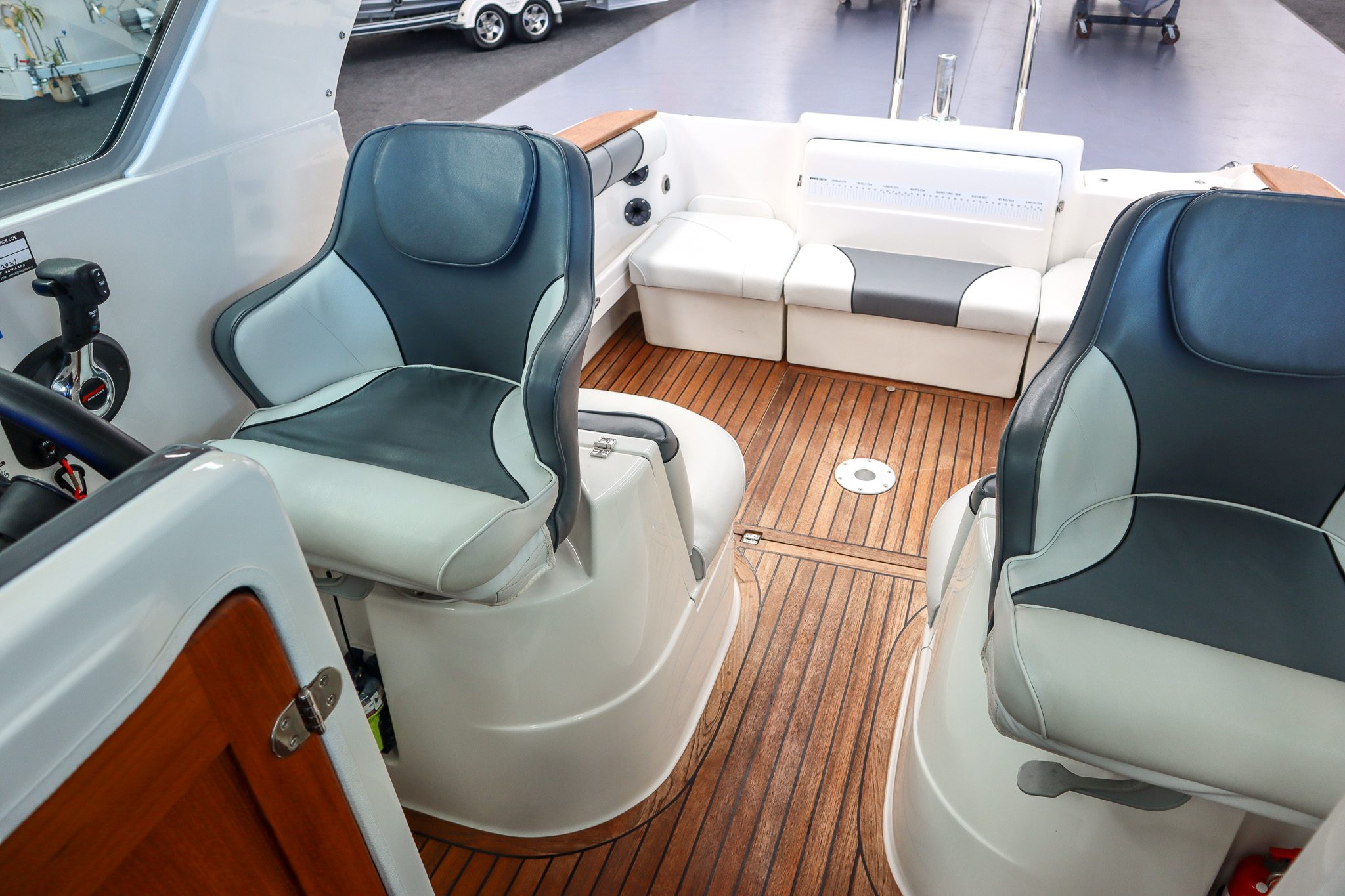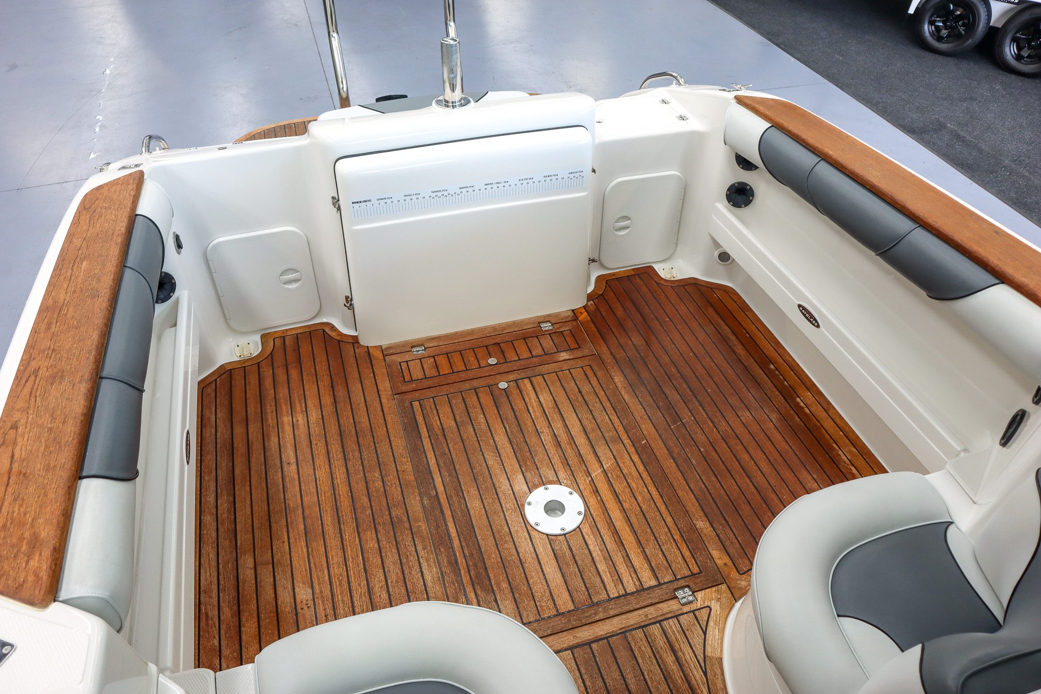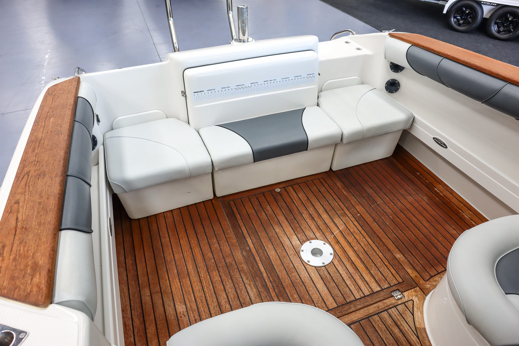 The teak flooring is a standout feature, giving this boat a clean, premium finish while also remaining highly practical - something that really sets this Rayglass 2500 apart.