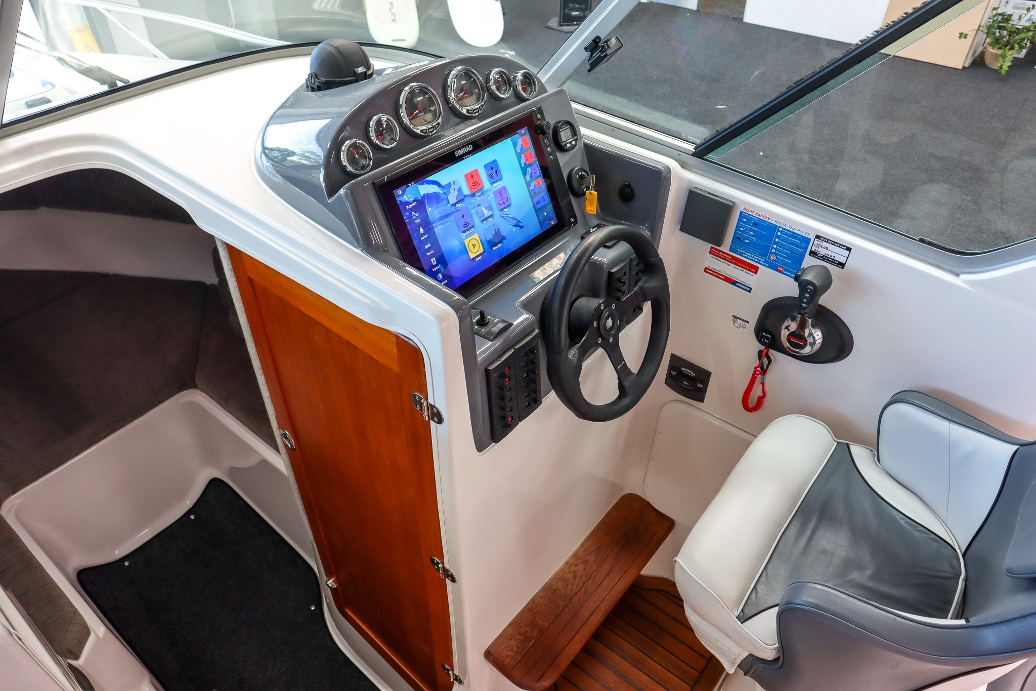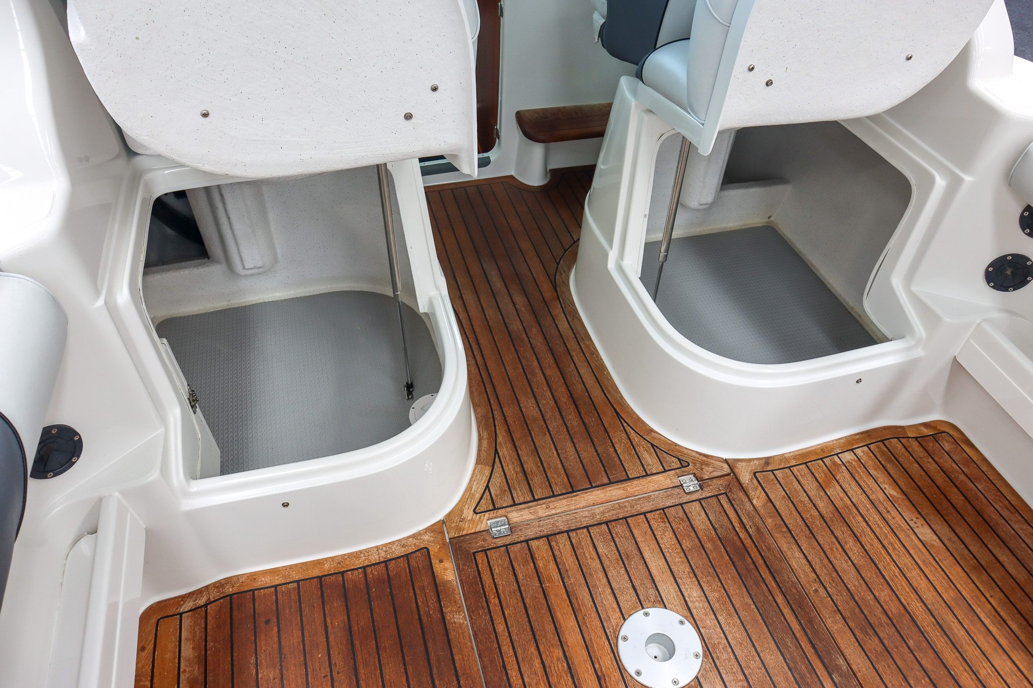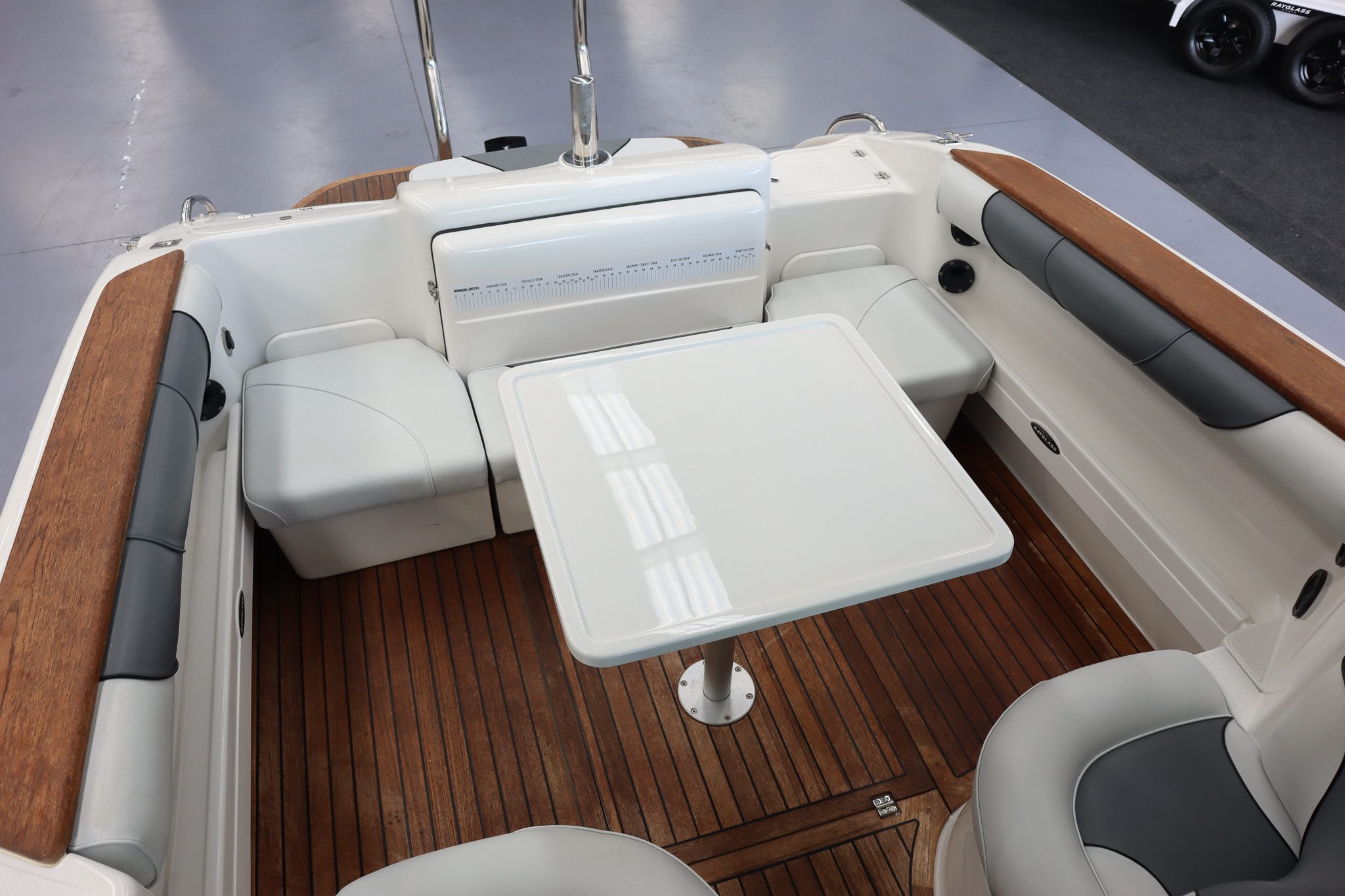 The teak flooring is a standout feature, giving this boat a clean, premium finish while also remaining highly practical - something that really sets this Rayglass 2500 apart.