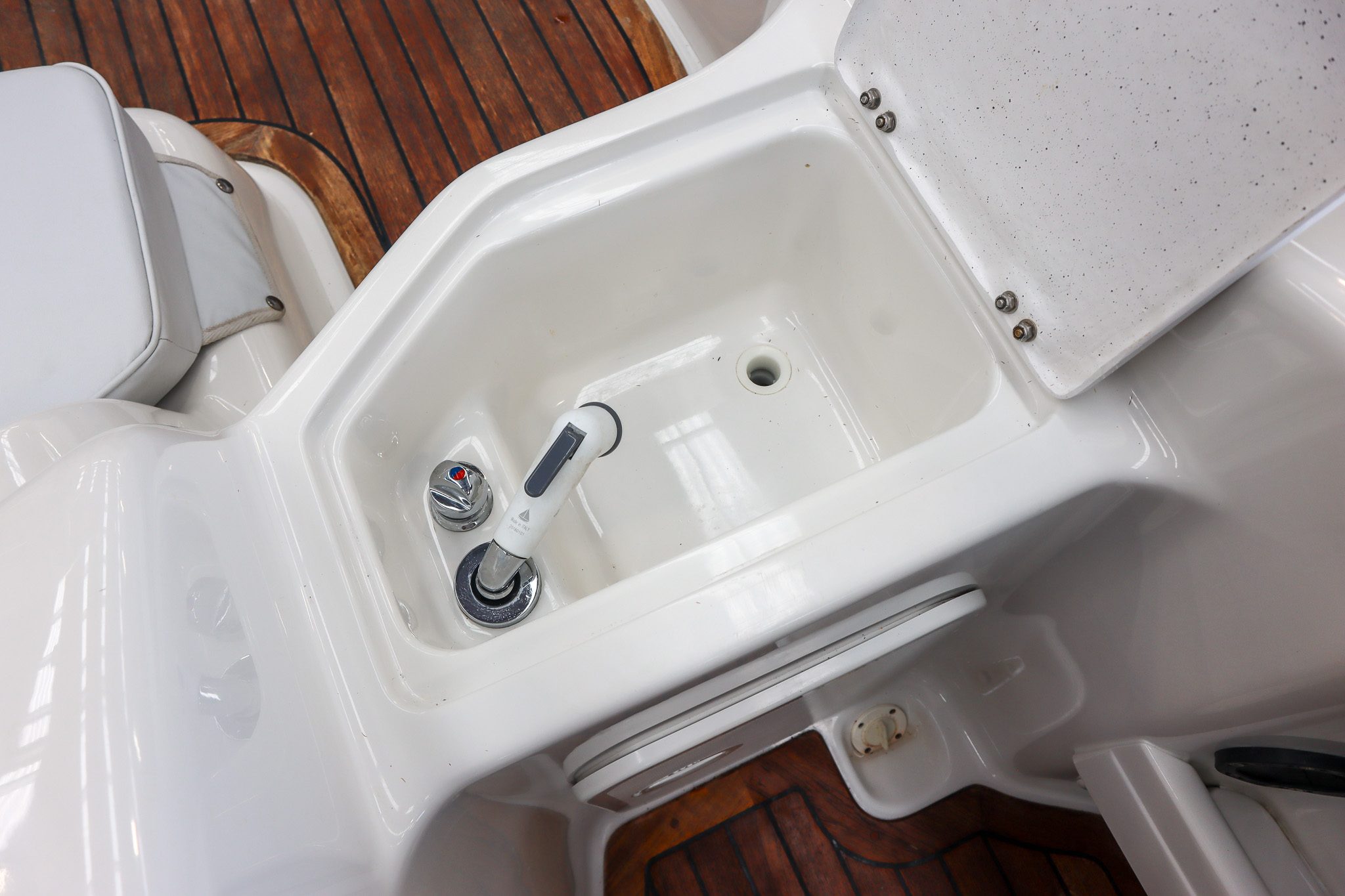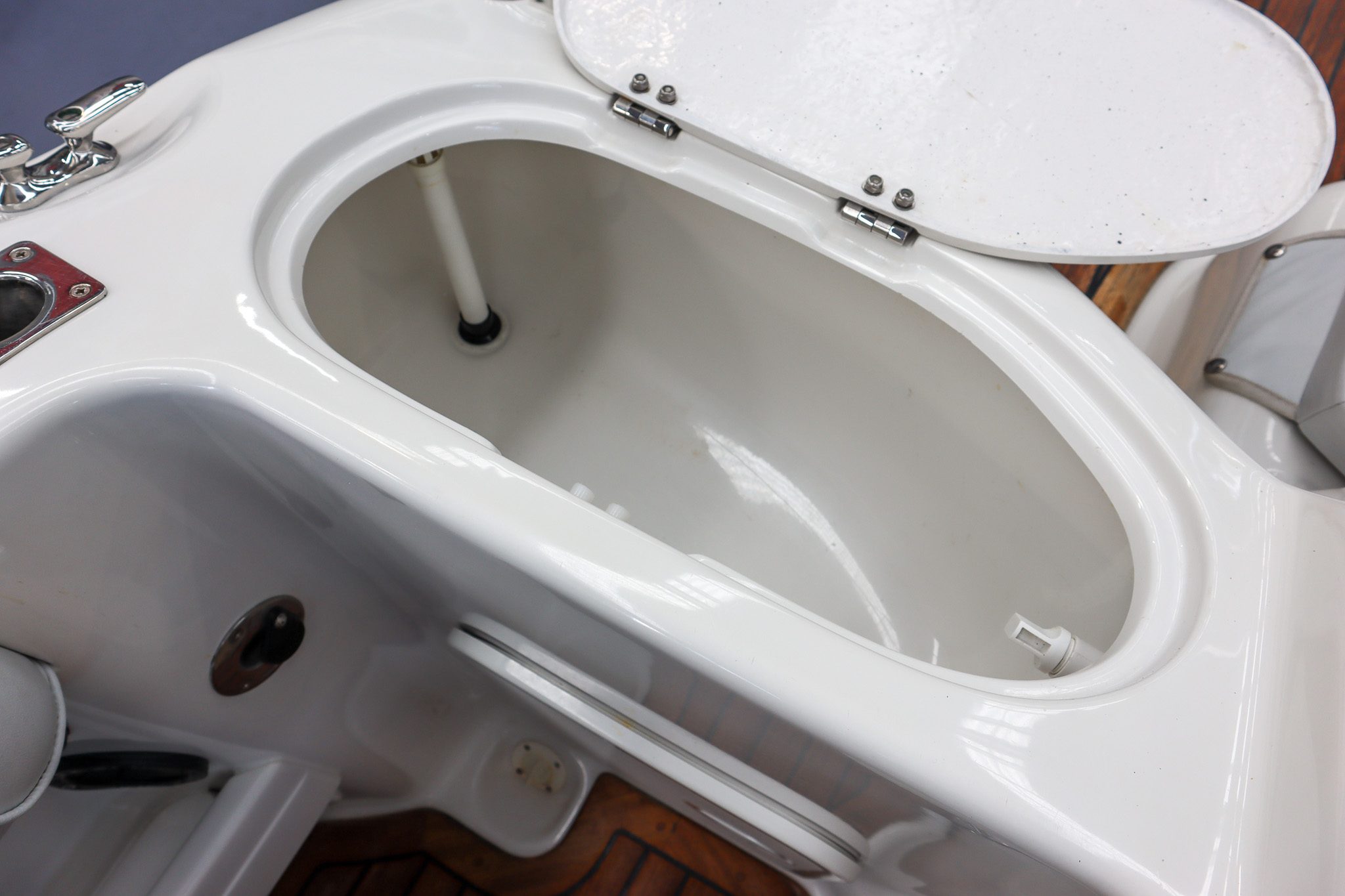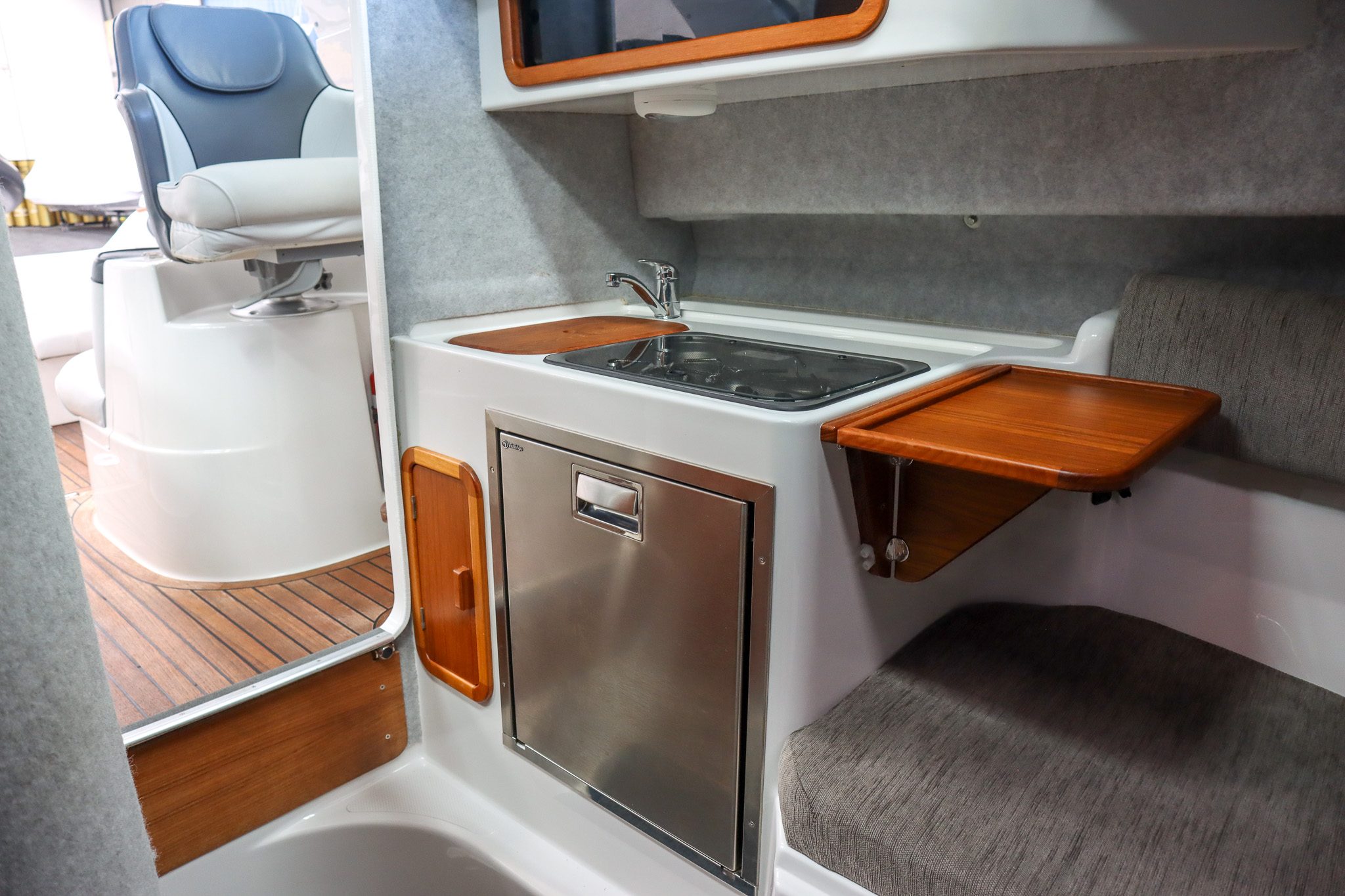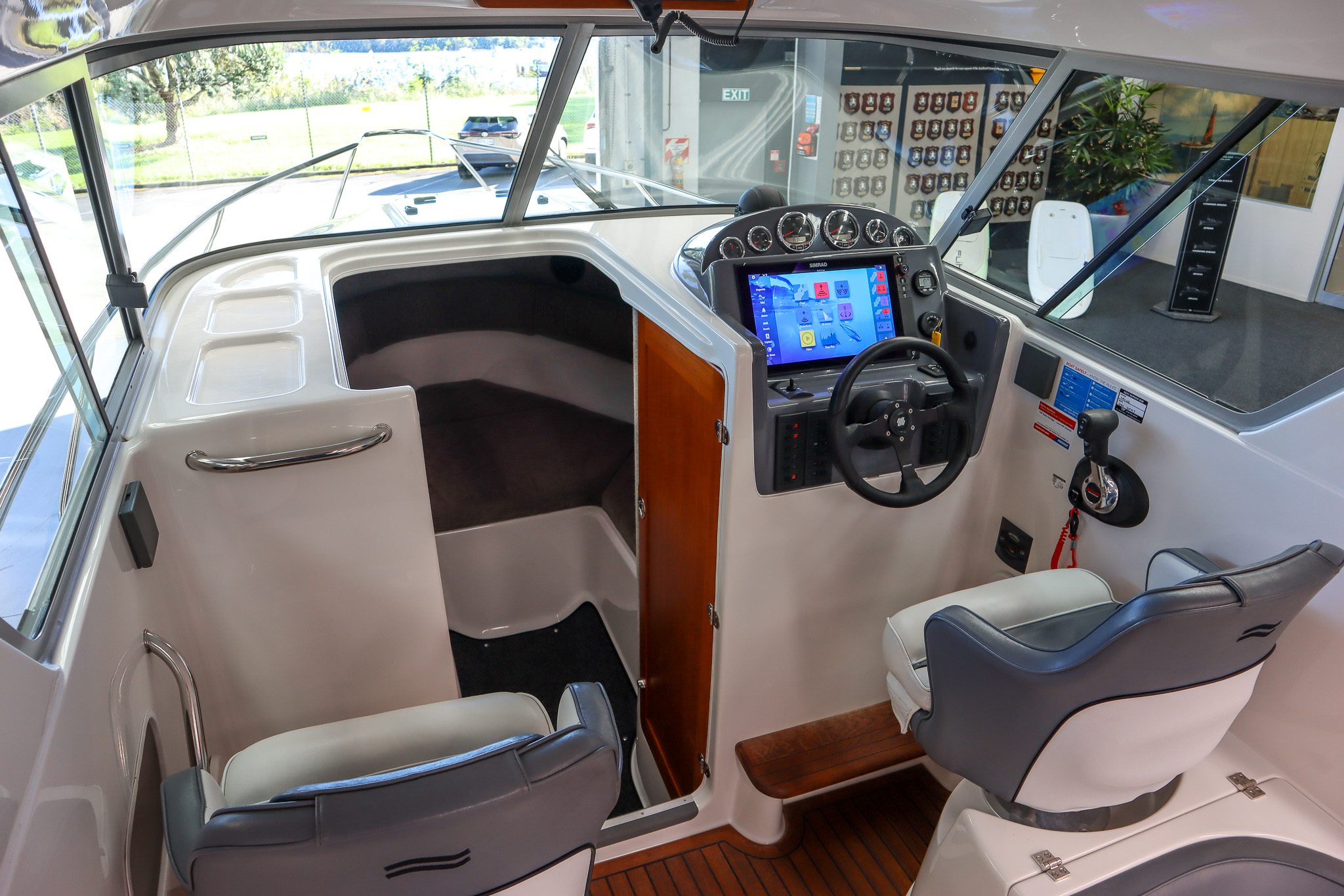 The teak flooring is a standout feature, giving this boat a clean, premium finish while also remaining highly practical - something that really sets this Rayglass 2500 apart.