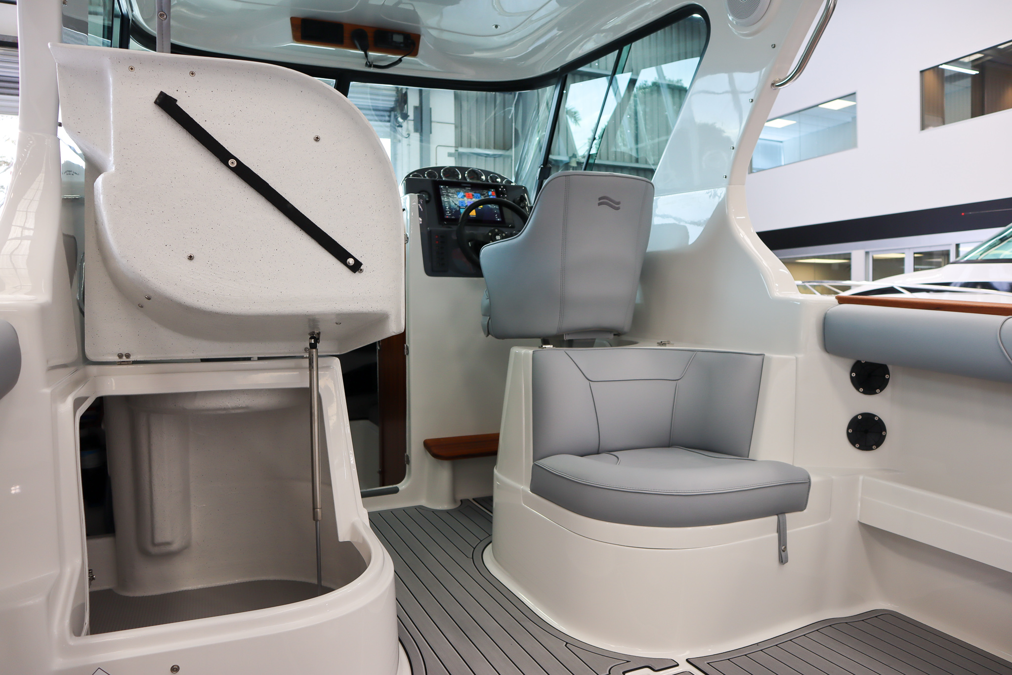 - Upholstered cabin squabs with storage underneath