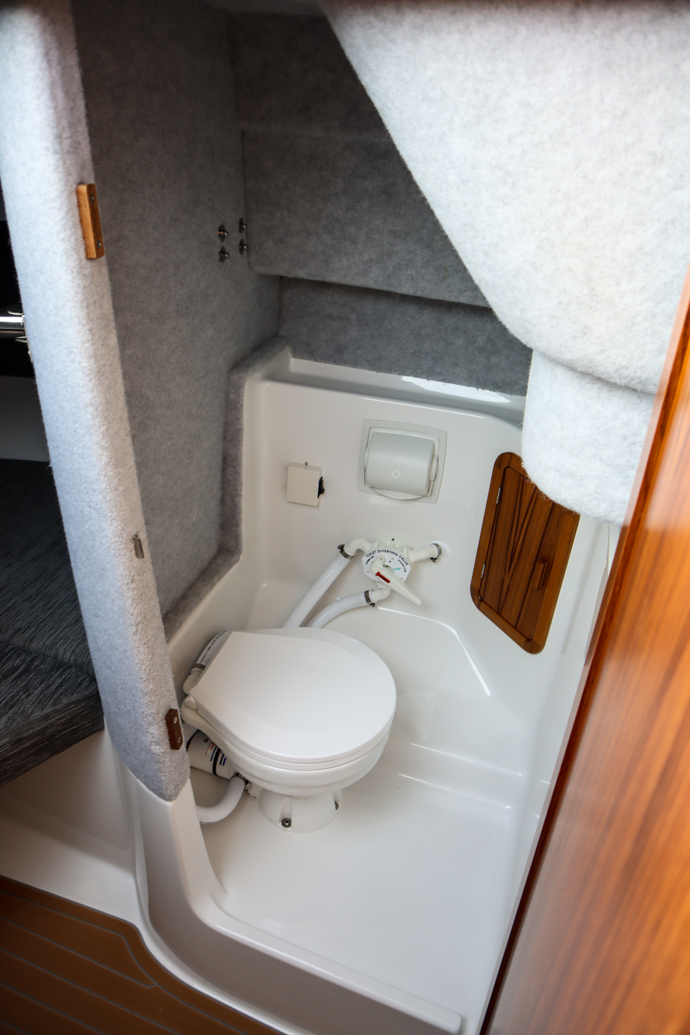 - Separate electric flush toilet with teak door