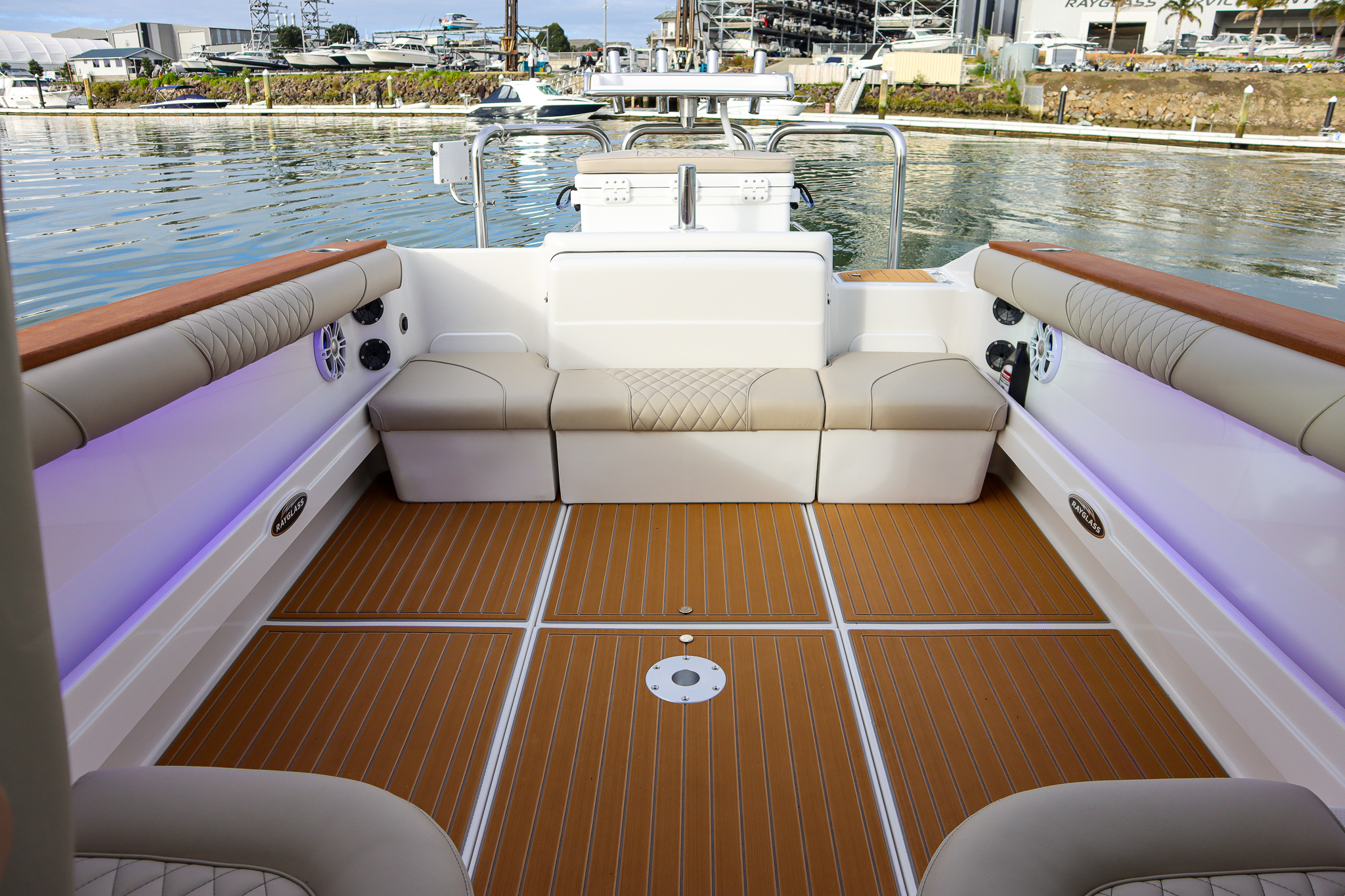 - Blue LED strip lights under teak coamings