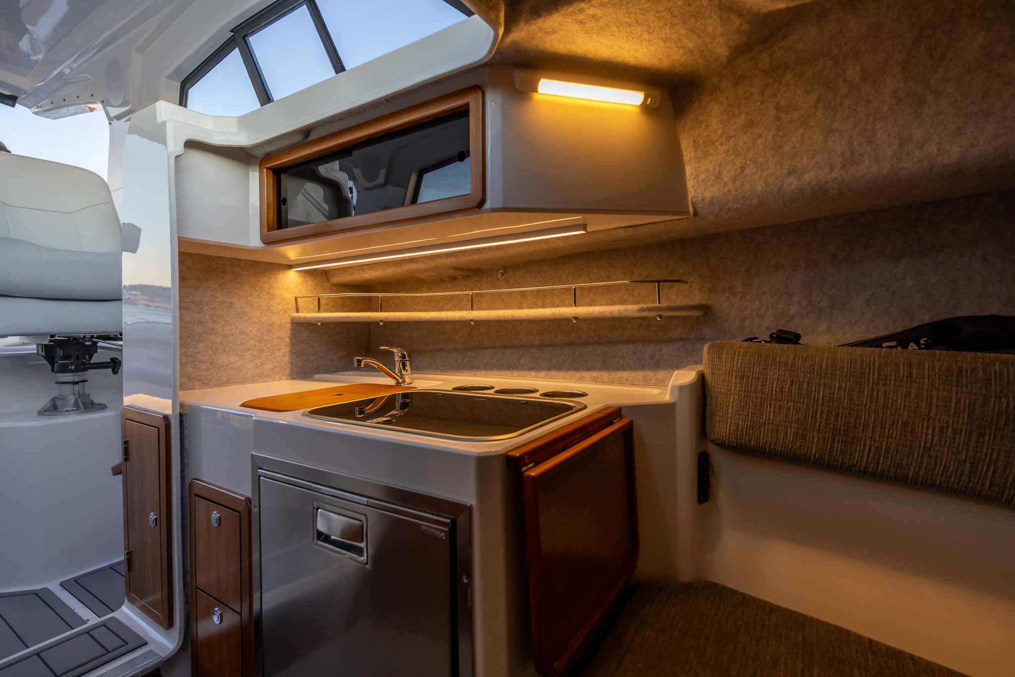 - Upholstered cabin squabs with storage beneath