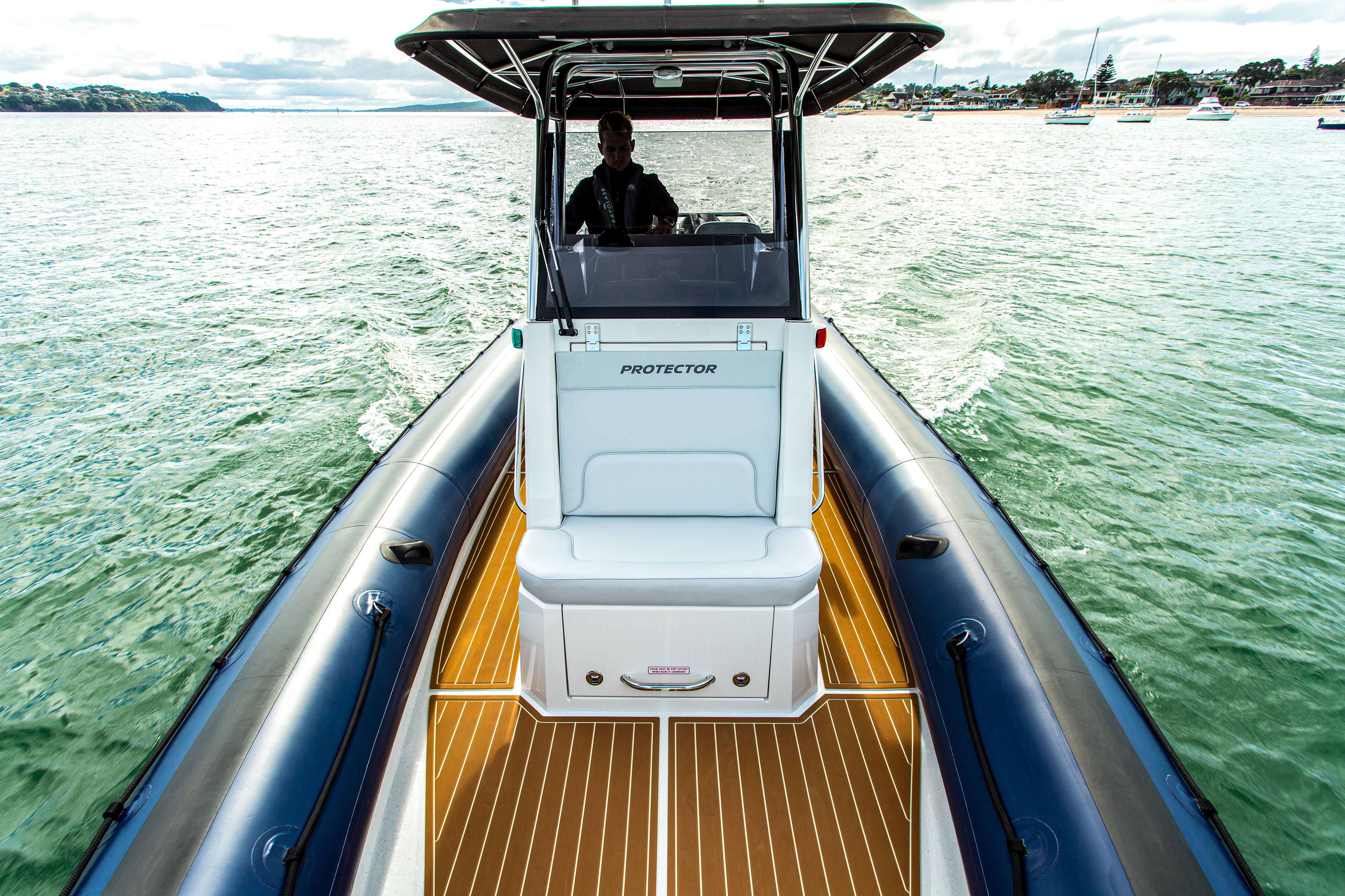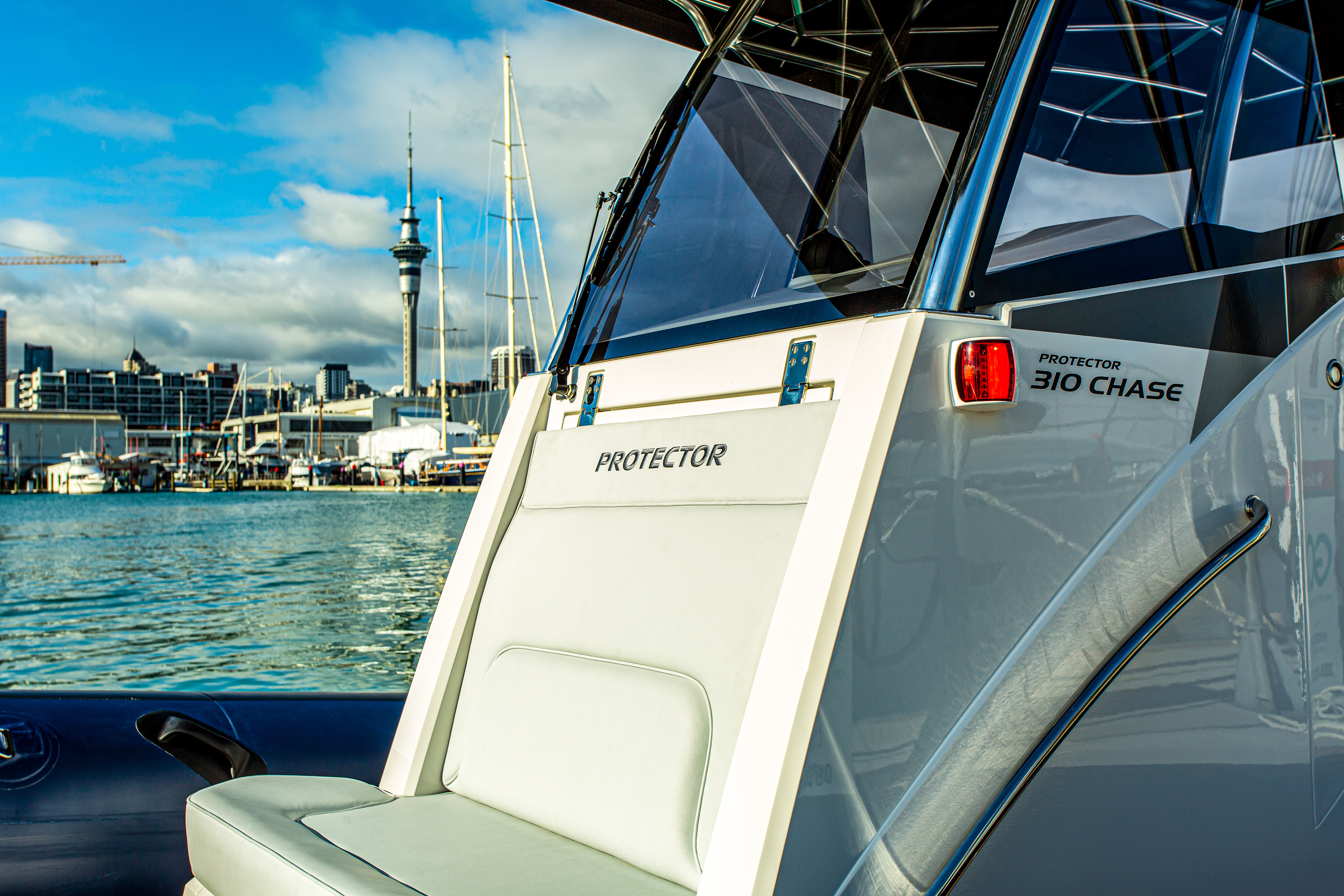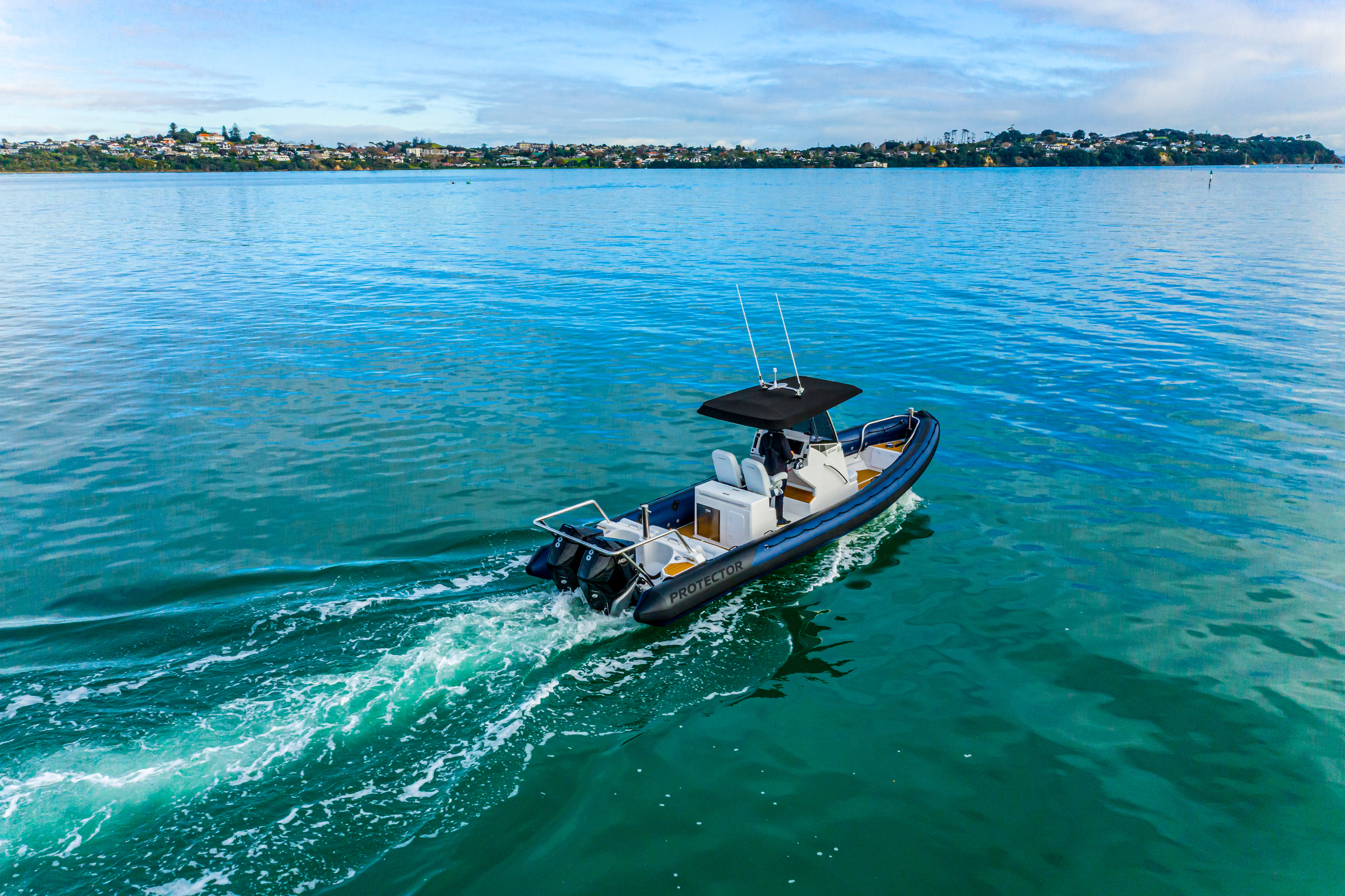 The Rayglass Protector 310 Chase is the ultimate high-performance utility vessel. It’s advanced design and efficient hull ensures that it rides smooth and steady in true Protector fashion. There’s even the option to include a number of luxuries like a wet bar with a fridge, sink and fresh water or an on board toilet. The full-sized bimini offers protection from the elements, and the spacious 360° walk-around deck features two comfortable, shock mitigating captains chairs at the helm as well as the option to have luxury seating at the transom. This is the ideal boat for recreational users who want a high performing vessel for diving and fishing, or as a tender for remote baches, super-yachts and yacht racing syndicates alike.