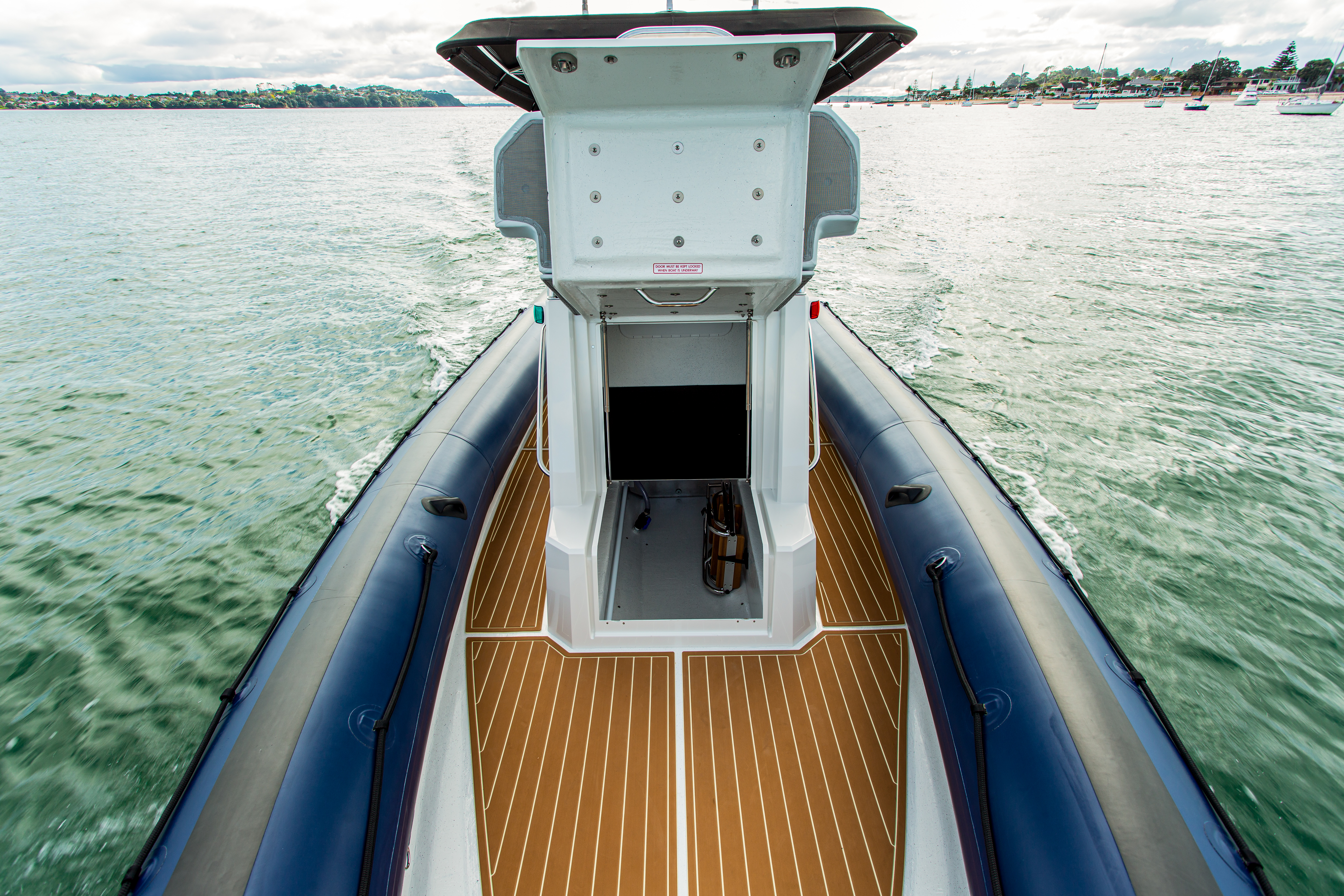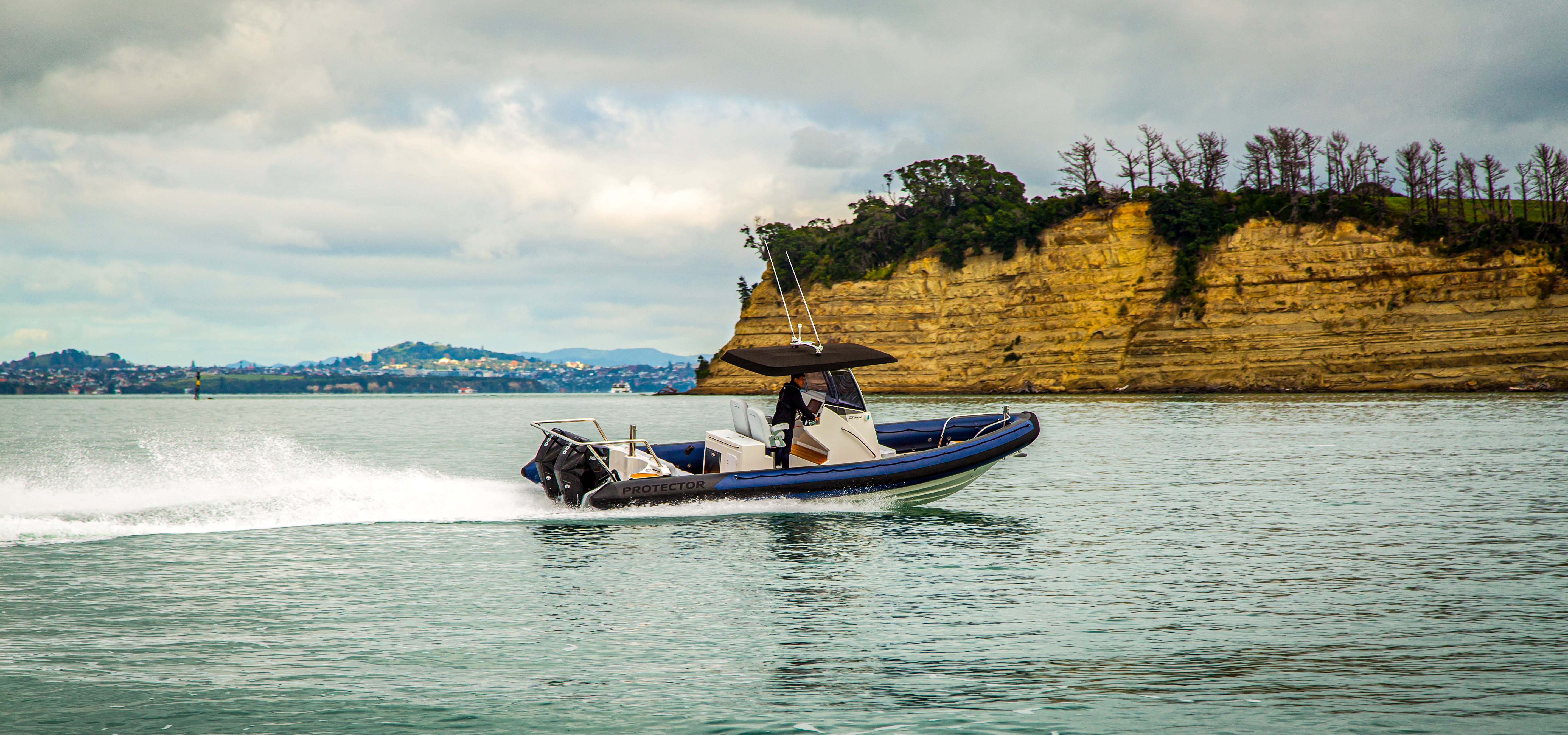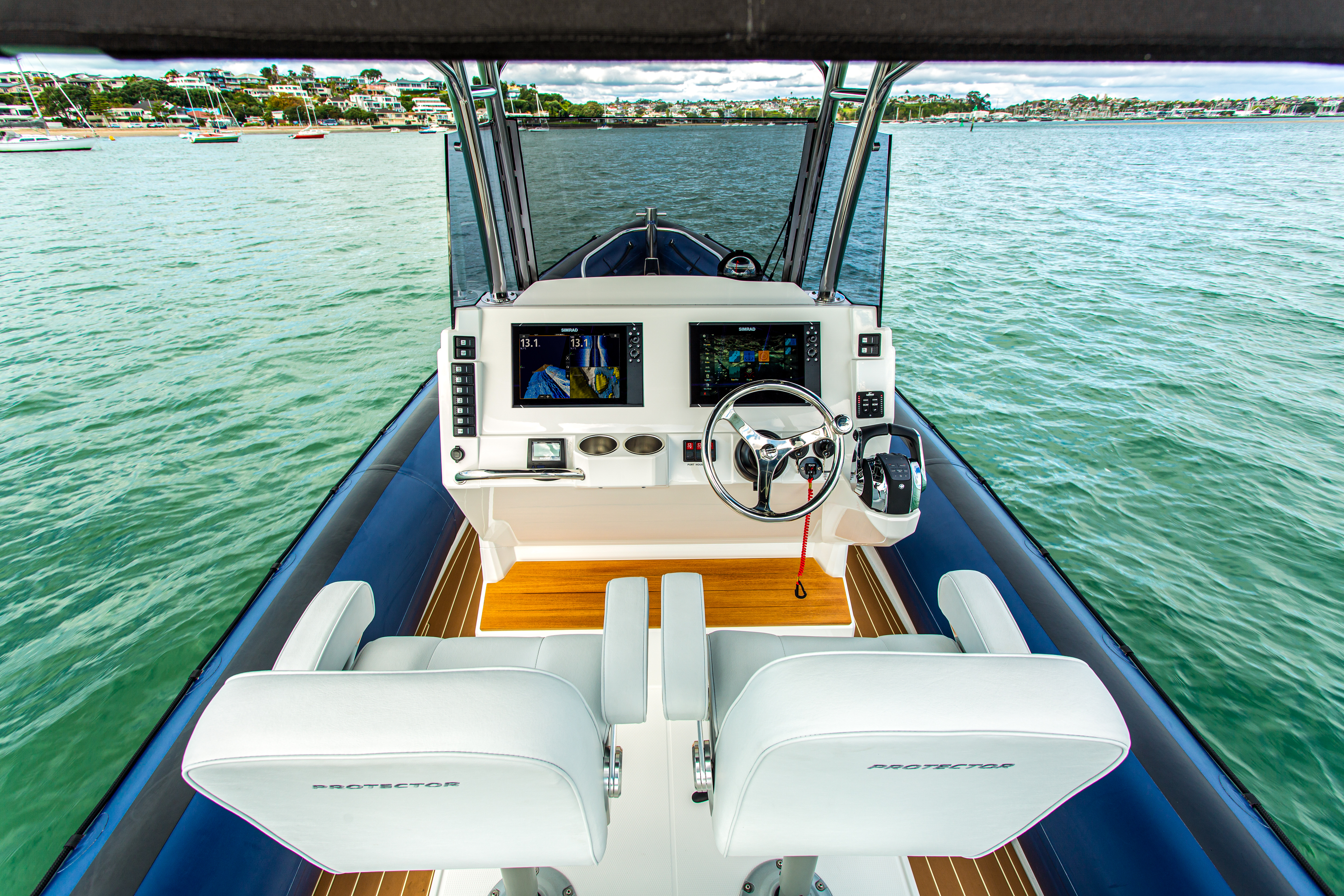 The Rayglass Protector 310 Chase is the ultimate high-performance utility vessel. It’s advanced design and efficient hull ensures that it rides smooth and steady in true Protector fashion. There’s even the option to include a number of luxuries like a wet bar with a fridge, sink and fresh water or an on board toilet. The full-sized bimini offers protection from the elements, and the spacious 360° walk-around deck features two comfortable, shock mitigating captains chairs at the helm as well as the option to have luxury seating at the transom. This is the ideal boat for recreational users who want a high performing vessel for diving and fishing, or as a tender for remote baches, super-yachts and yacht racing syndicates alike.