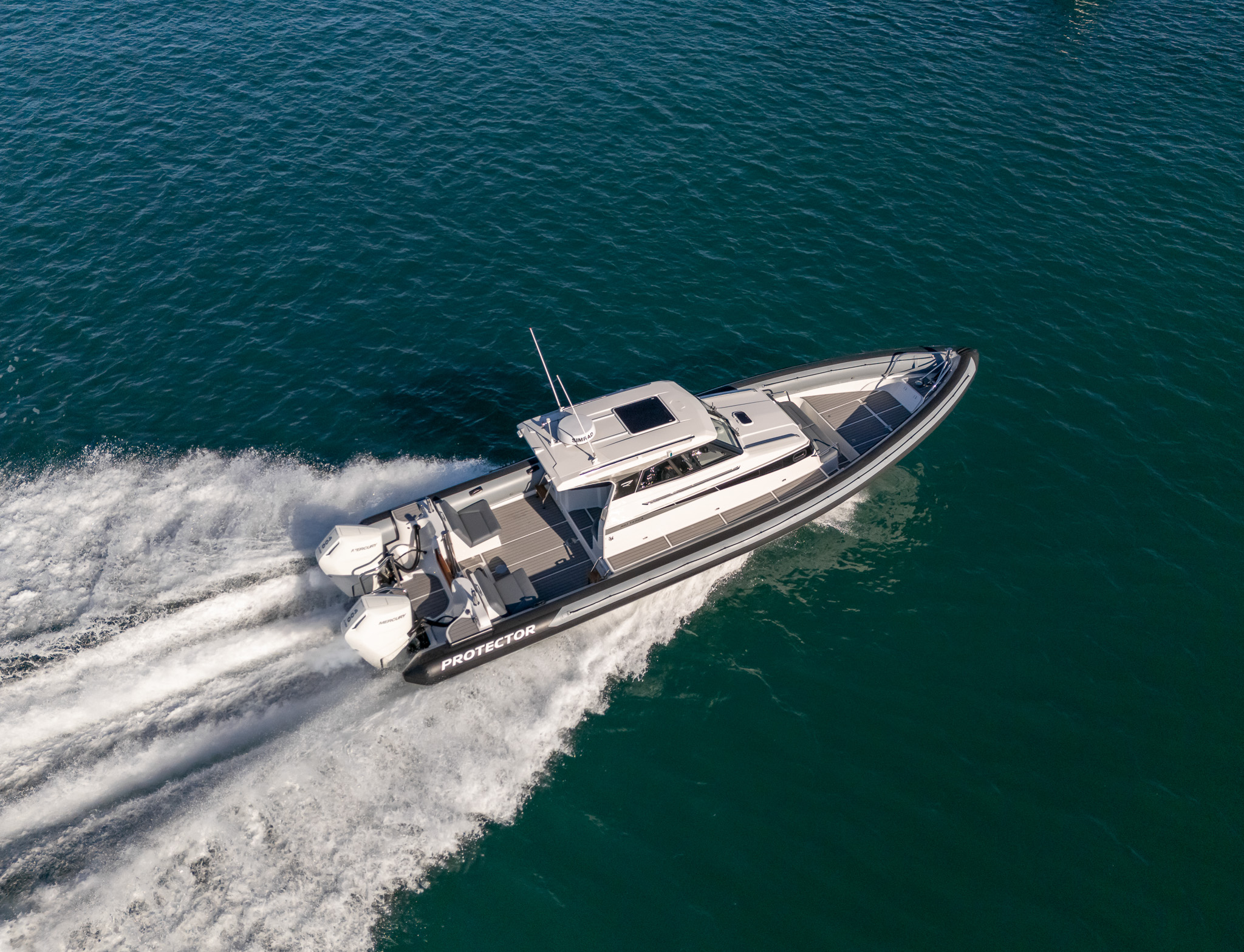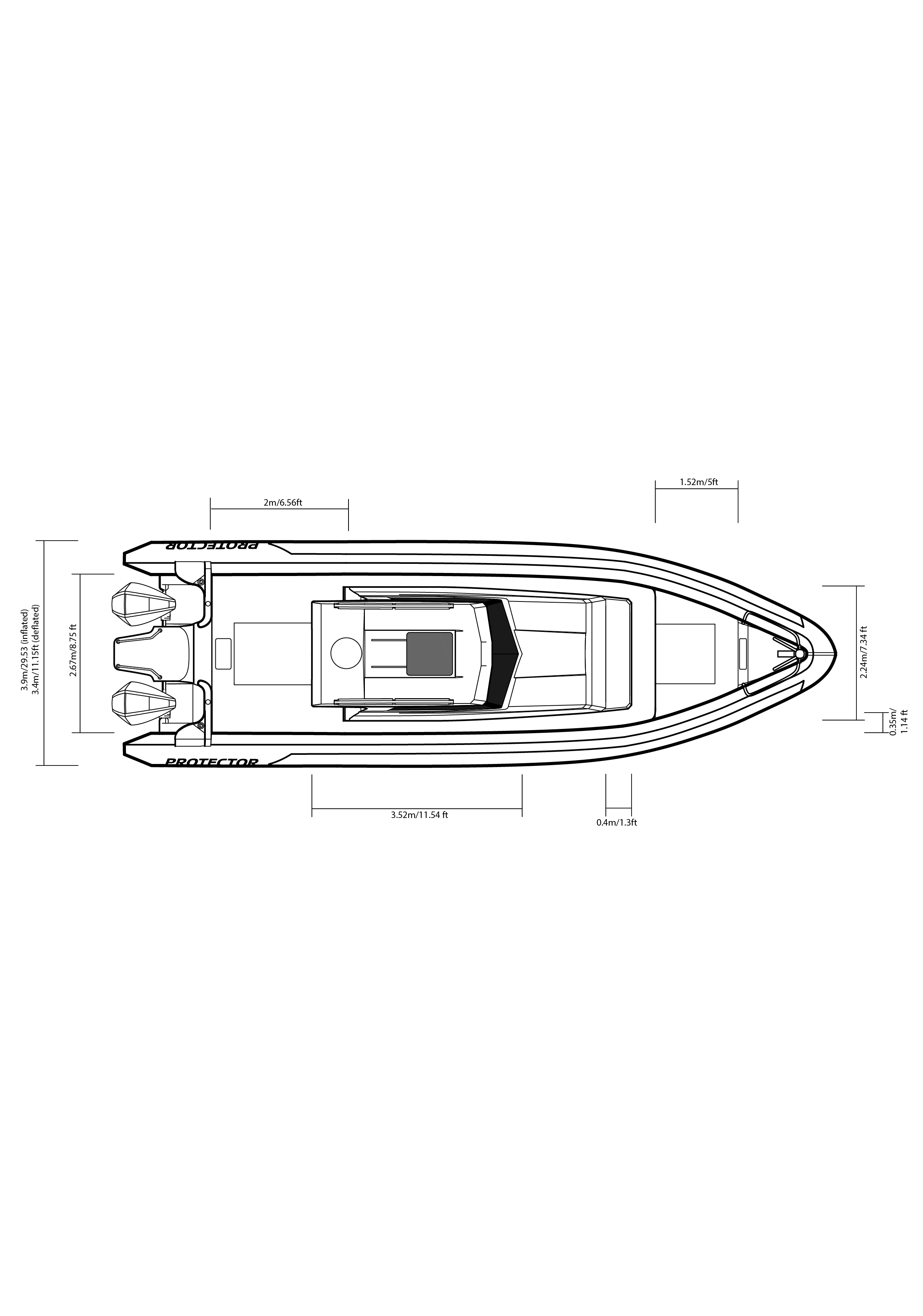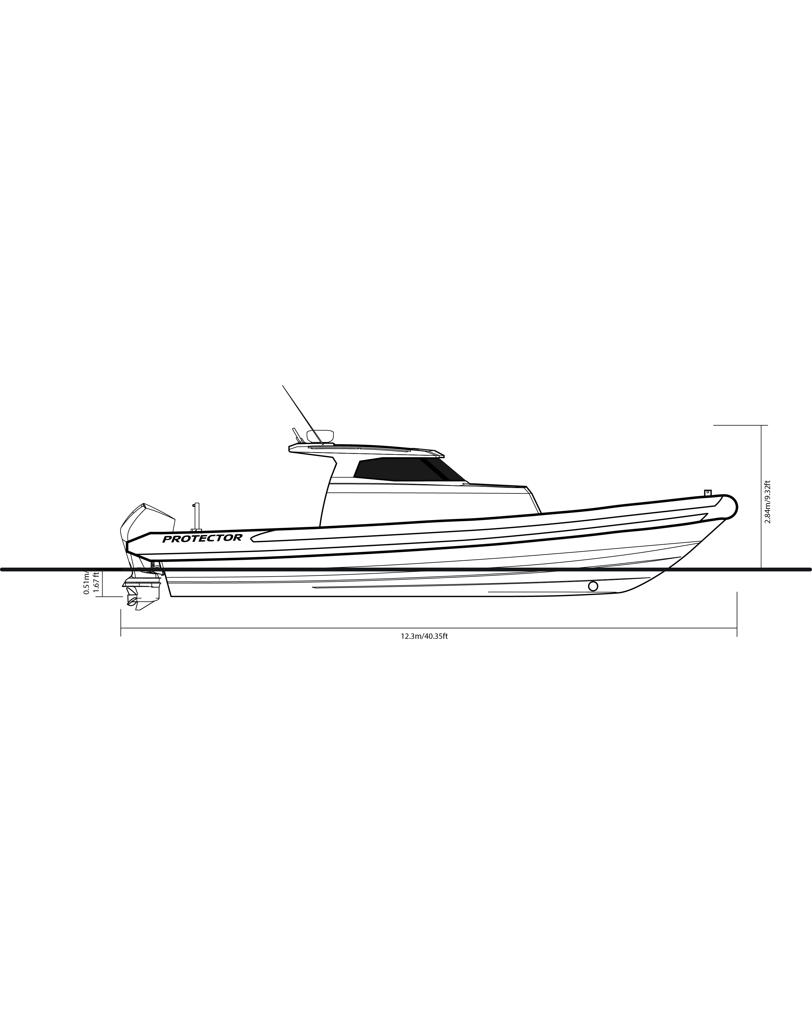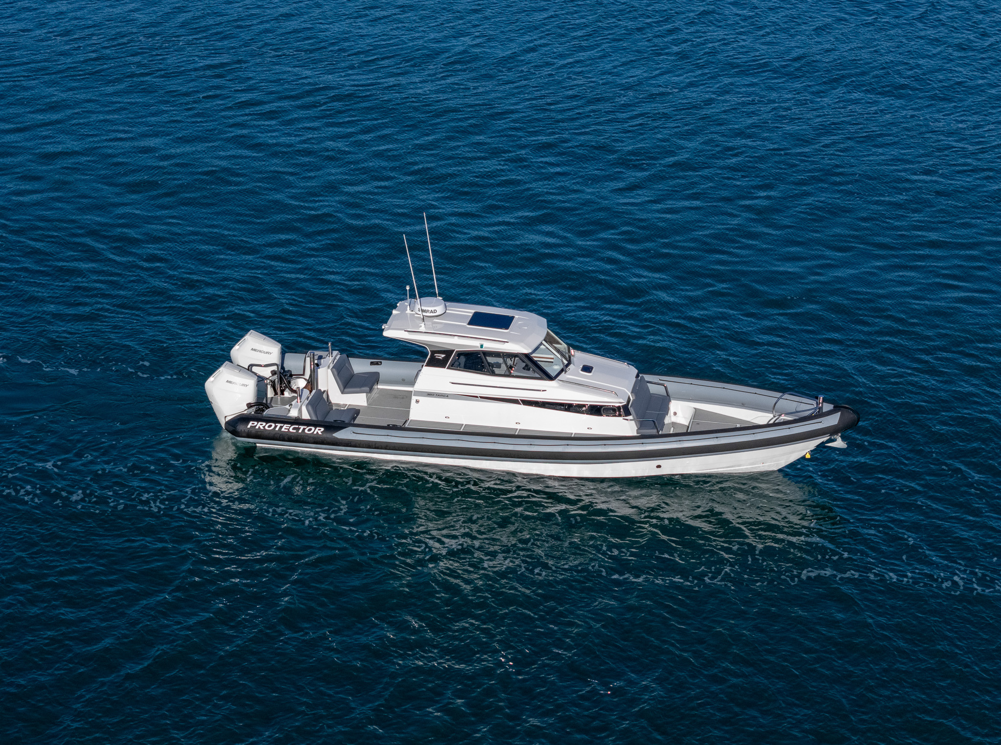 The Protector 380 Targa is a true-blue water performer, ideal for serious recreational users or demanding commercial users who require the best. The 380 Targa is the ultimate example of a seriously capable, comfortable, high performing RIB found worldwide. Designed for ‘tough luxury’ in any sea conditions, the 380 Targa features a spacious cabin layout, expansive interior, a fully enclosed standing head, as well as a multitude of entertainment options and passenger comforts. Besides its performance, one of the defining features of the 380 Targa is its expansive deck space, featuring a 9.5’ internal beam and full walk around allowing quick and easy access to the bow.