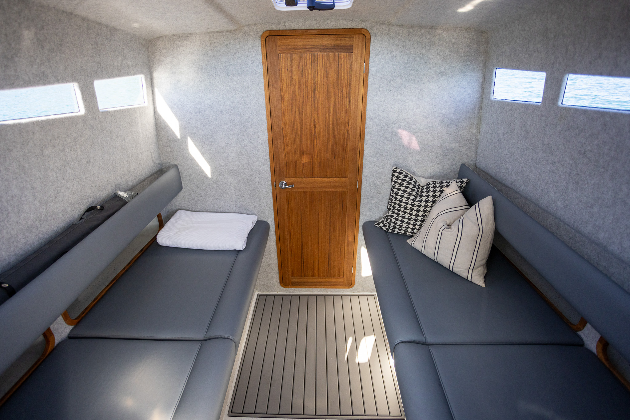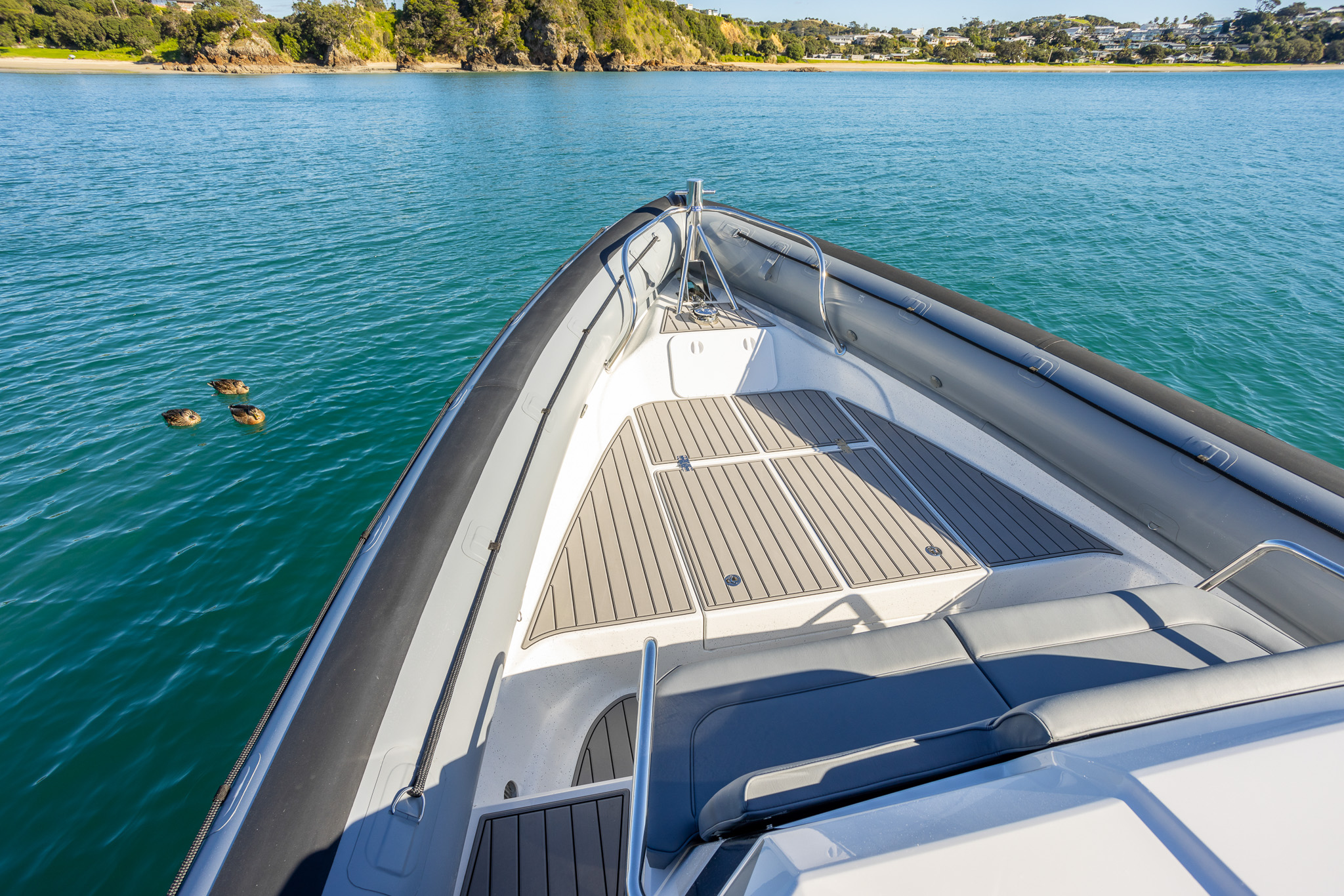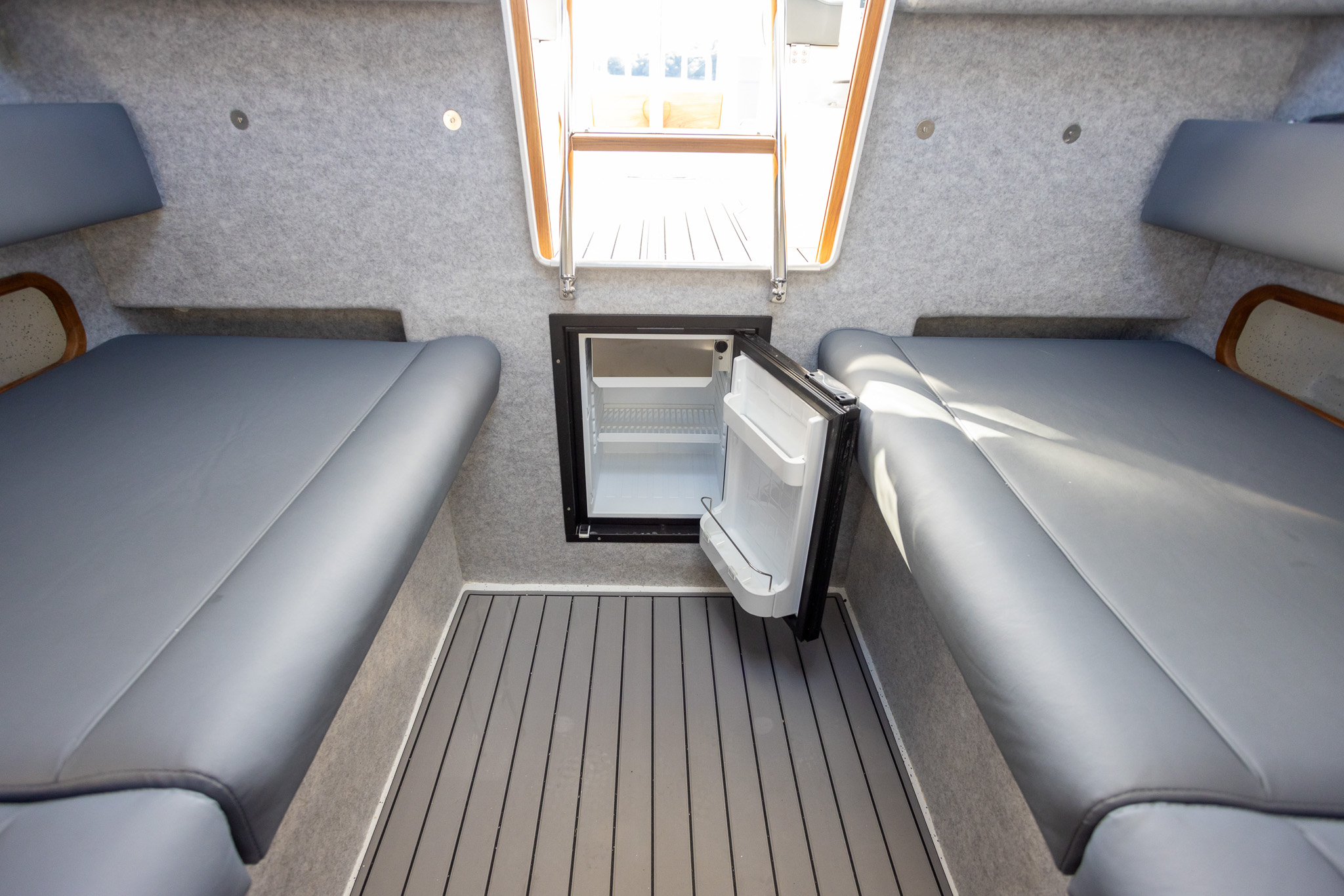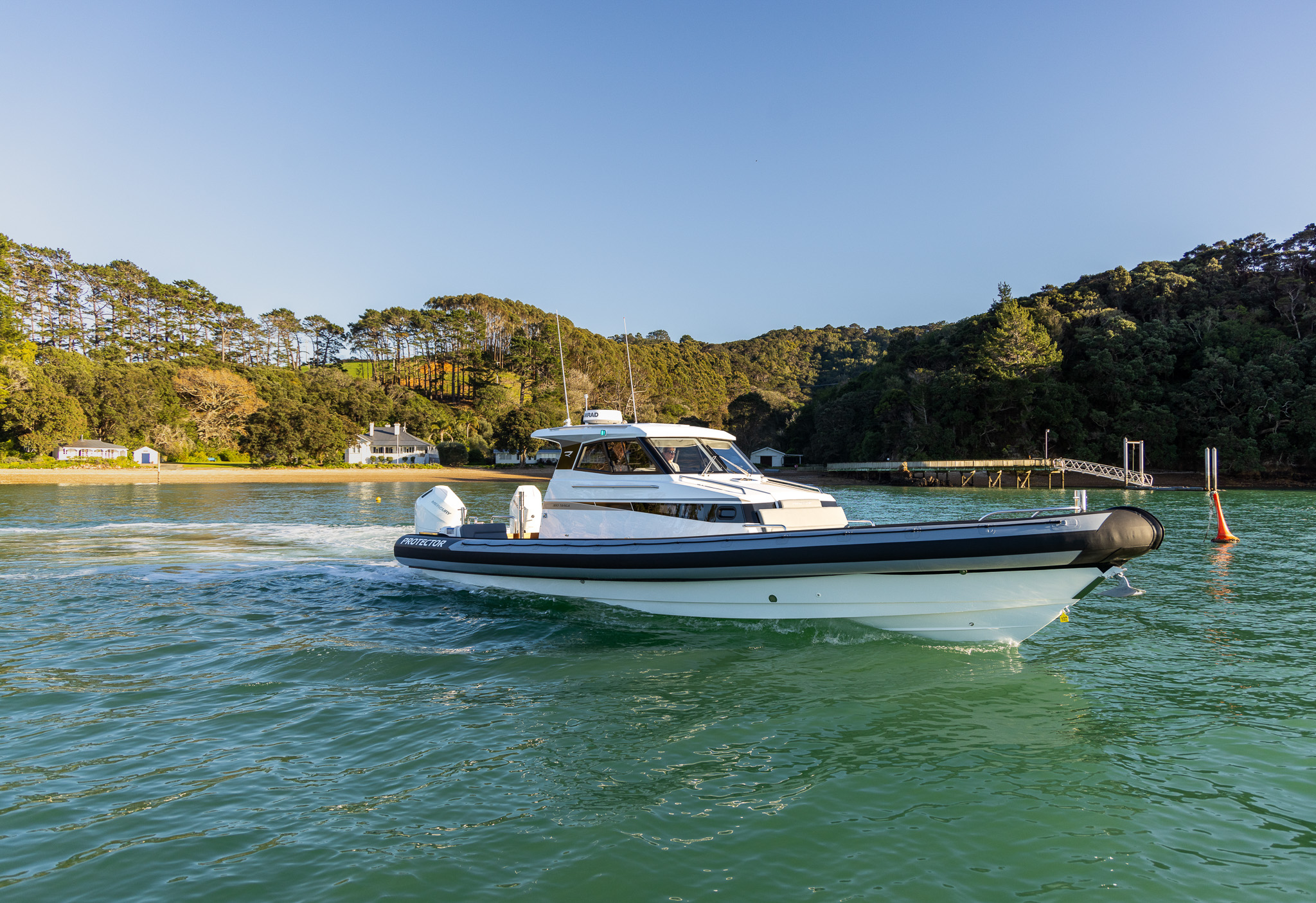 The Protector 380 Targa is a true-blue water performer, ideal for serious recreational users or demanding commercial users who require the best. The 380 Targa is the ultimate example of a seriously capable, comfortable, high performing RIB found worldwide. Designed for ‘tough luxury’ in any sea conditions, the 380 Targa features a spacious cabin layout, expansive interior, a fully enclosed standing head, as well as a multitude of entertainment options and passenger comforts. Besides its performance, one of the defining features of the 380 Targa is its expansive deck space, featuring a 9.5’ internal beam and full walk around allowing quick and easy access to the bow.