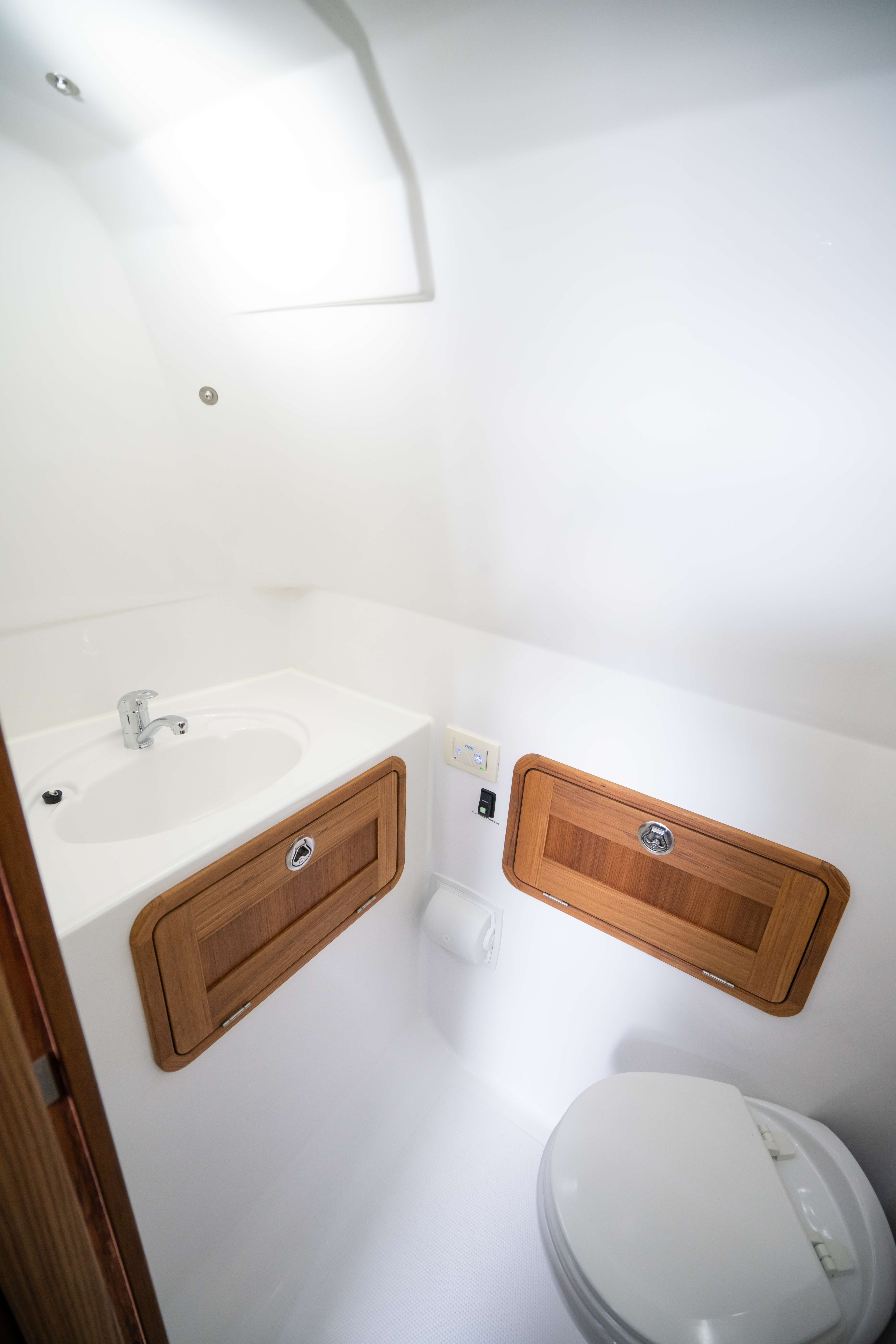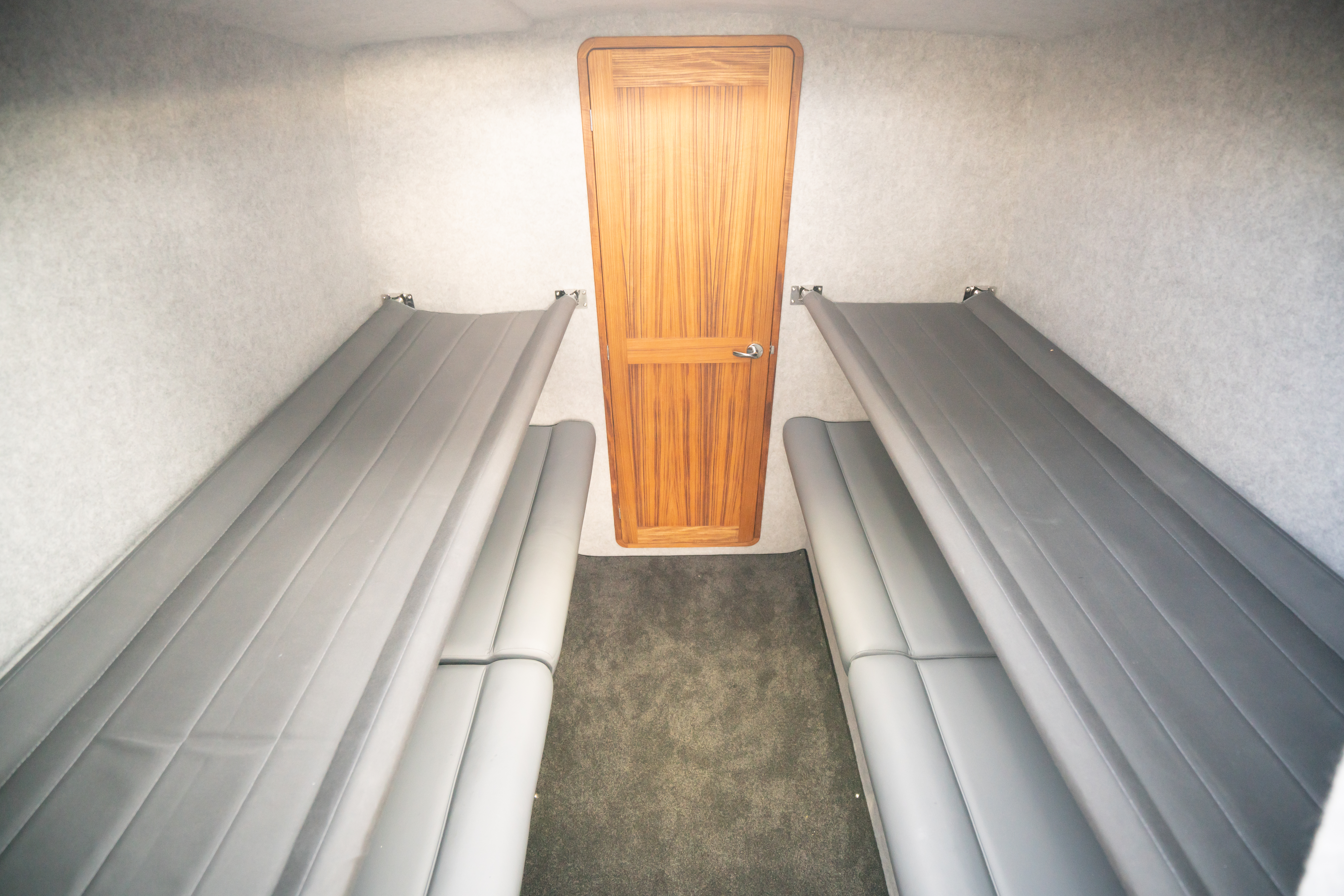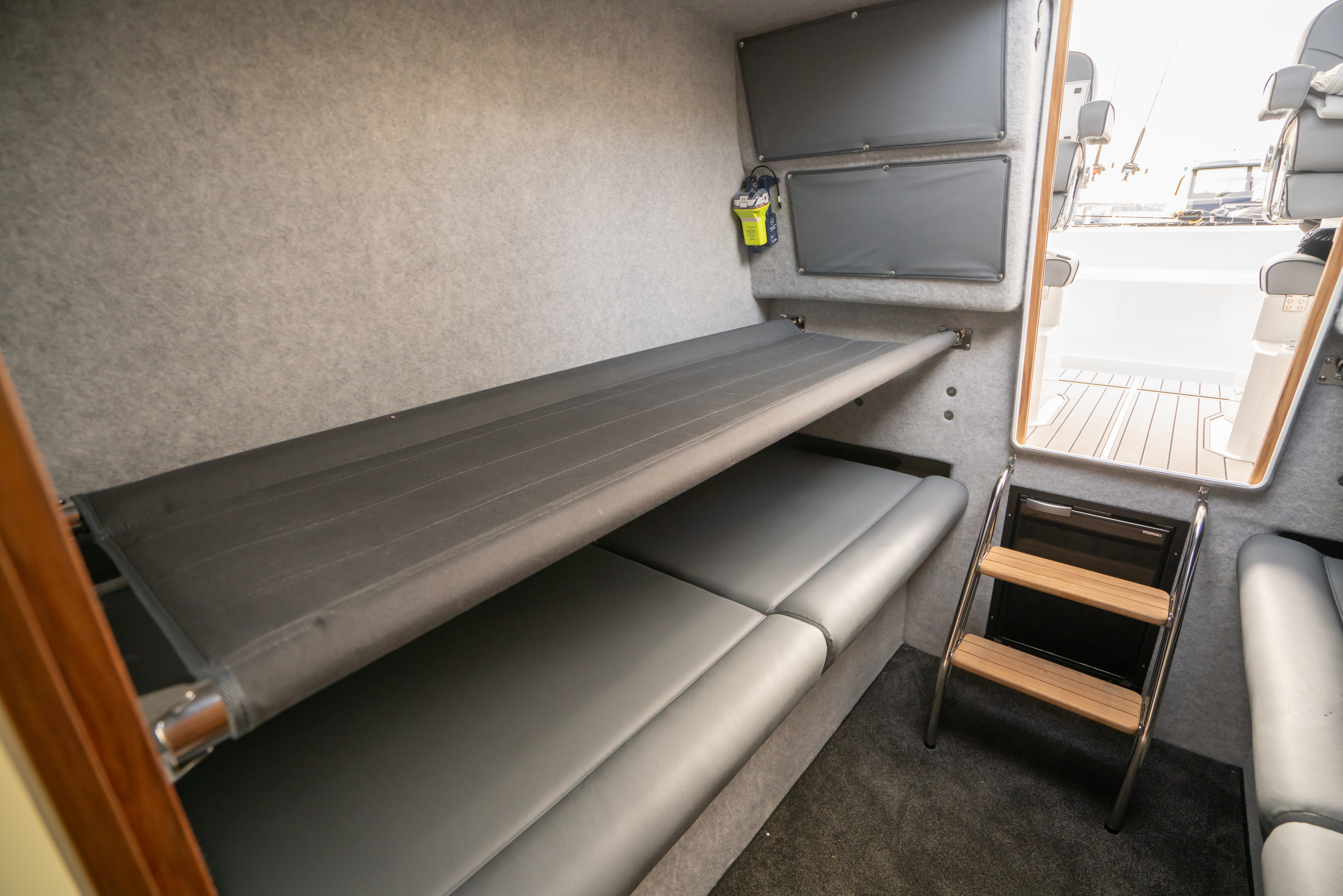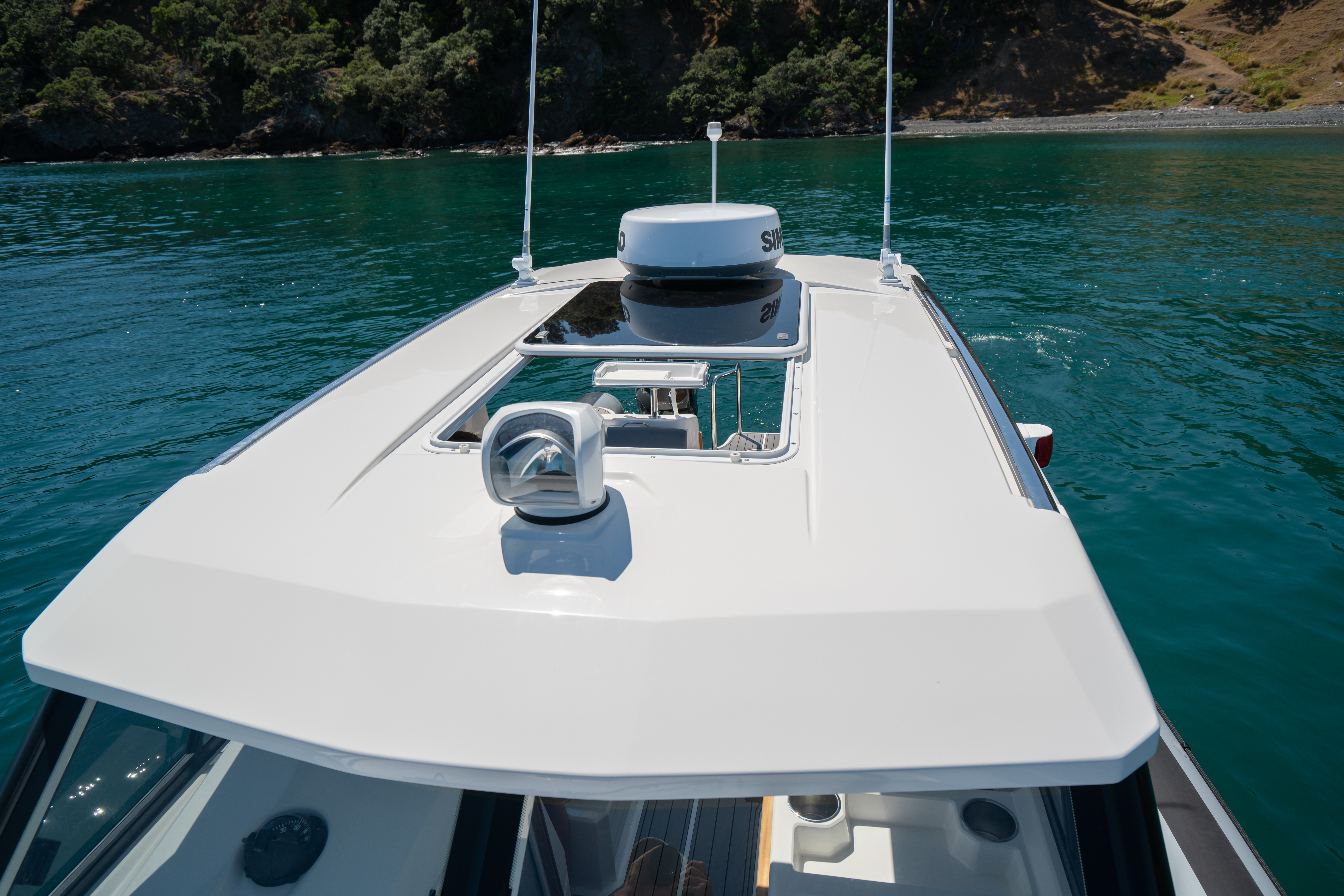 Designed for ‘tough luxury’ in any sea conditions, the 410 Targa features a spacious cabin layout, expansive interior, a fully enclosed standing head, as well as a multitude of entertainment options and passenger comforts. Besides its performance, one of the defining features of the 410 Targa is its expansive deck space, featuring a 9.5’ internal beam and full walk around allowing quick and easy access to the bow.